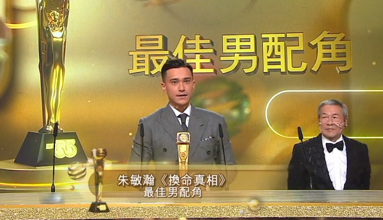 最佳男配角朱敏瀚(《换命真相》)上台领奖之后说了一大串“多谢”,说非常感谢曾志伟让他看到希望,草根演员的不易引发了全场掌声。