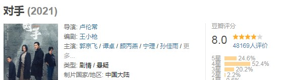 作为2021年下半年开播的最好谍战剧,郭京飞、谭卓、颜丙燕、宁理主演的《对手》,以8分收官画上句号。