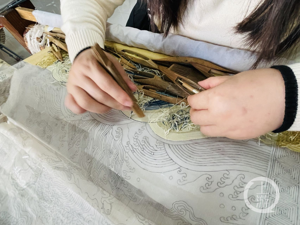 ▲1月4日,江苏相城,根据画稿图案配色后,缂丝师傅需使用专门的工具将缂丝的线压实。摄影/上游新闻记者 时婷婷
