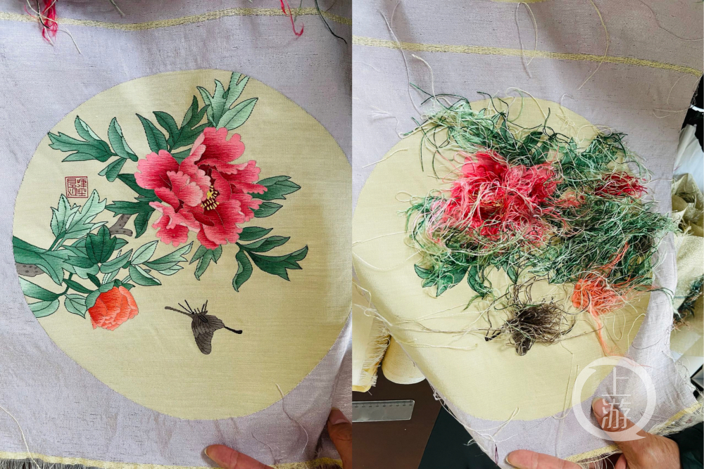 上游新闻记者体验后注意到,与刺绣不同,一幅刚刚完成的缂丝作品上会留有众多长短不一的纬线线头。王建江介绍,刺绣是在绸布的正面进行操作,而缂丝是将经线与纬线融会贯通,织工看到的是缂丝的背面效果。只有当一件缂丝作品完工下机后,才能显现出它的庐山真面目。此时就需要进行下一步的修剪程序。“需要用剪刀仔细地将留存的线头剪断,因为经线与纬线已交错相连,因此不用担心脱丝断线的情况。好的技工还可以缂出两面不同的花样。”王建江说。