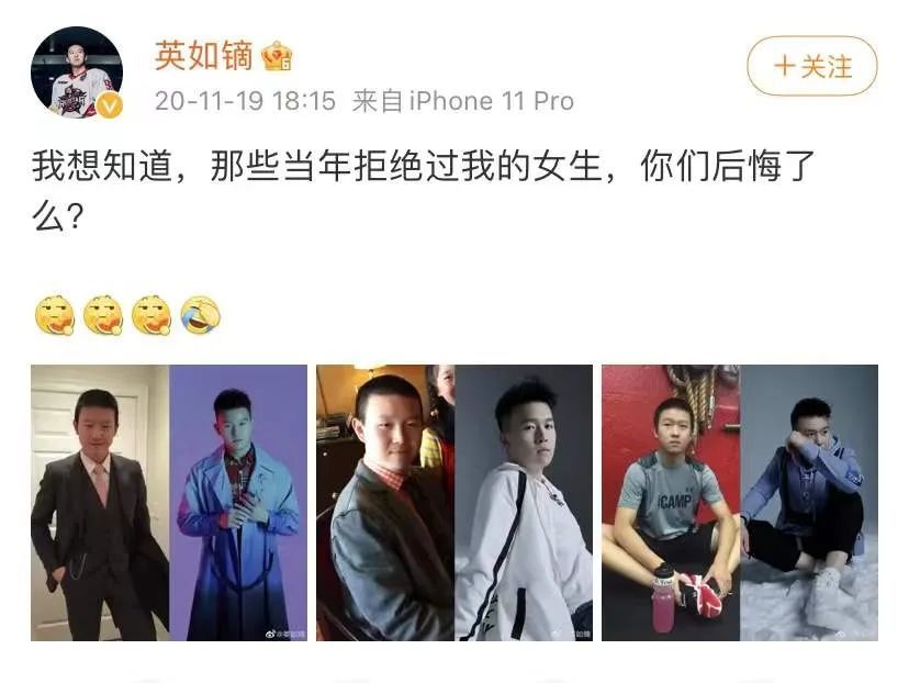 而从一些日常照来看,98年出生的英如镝俨然是运动风的年轻帅哥,之前还曾发过照片并配文“那些当年拒绝过我的女生,你们后悔了么?”言语之中还透出对现在颜值的小小自信。