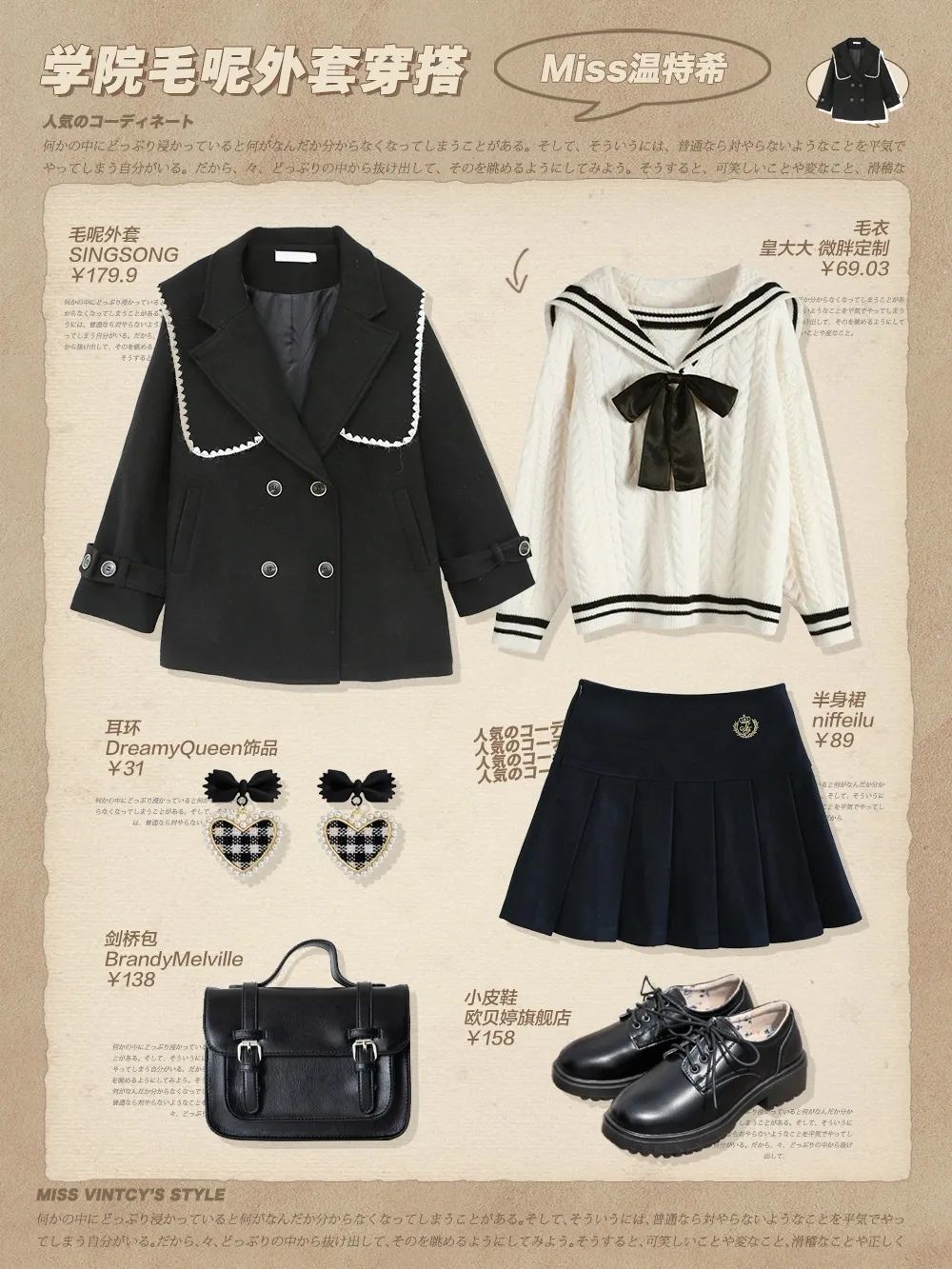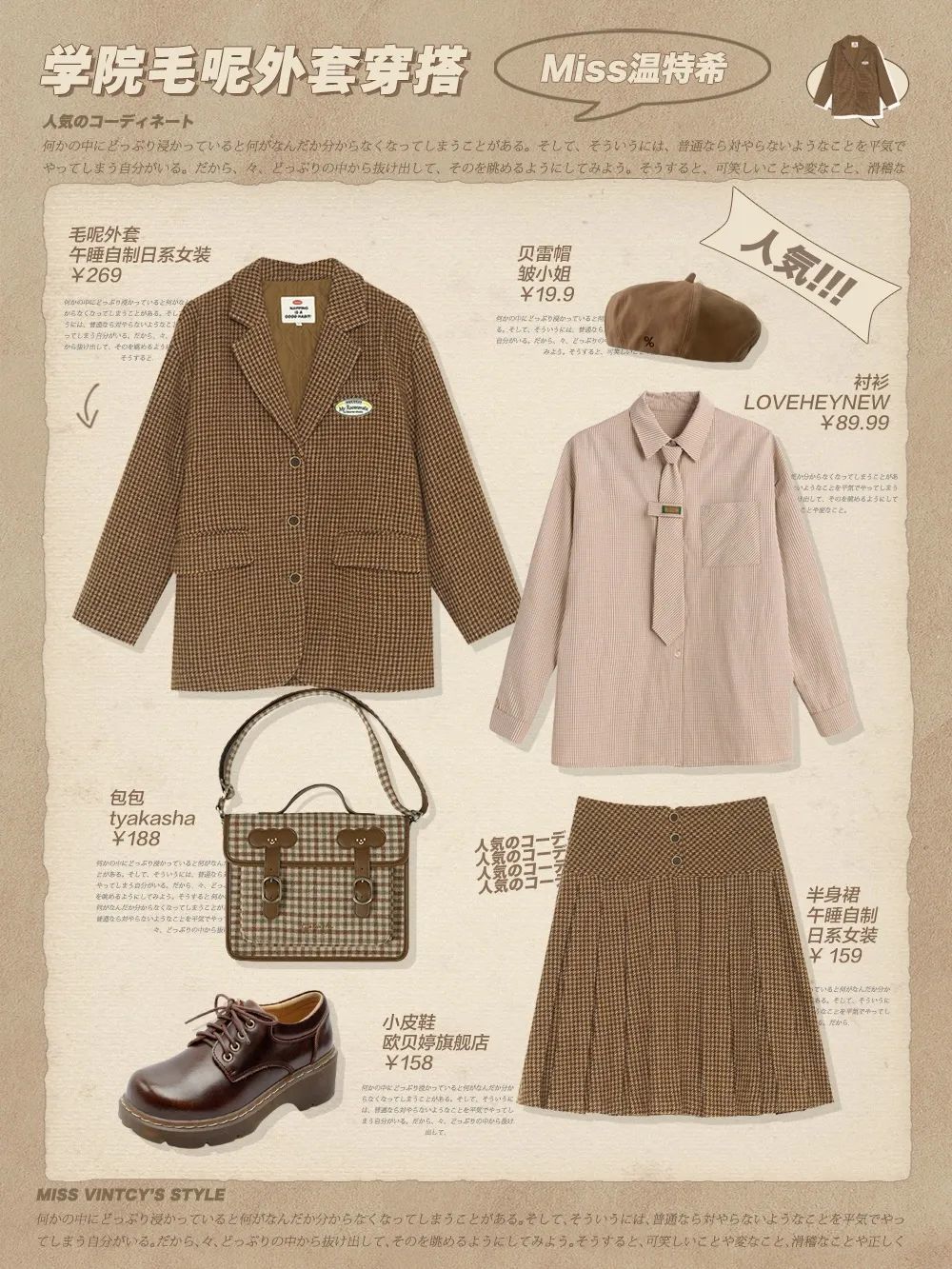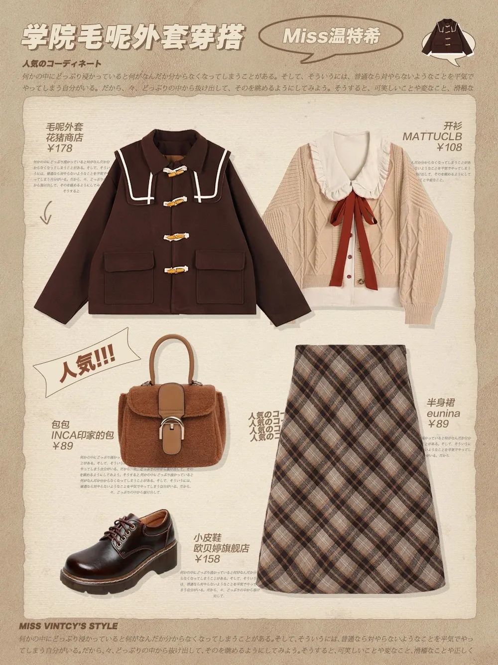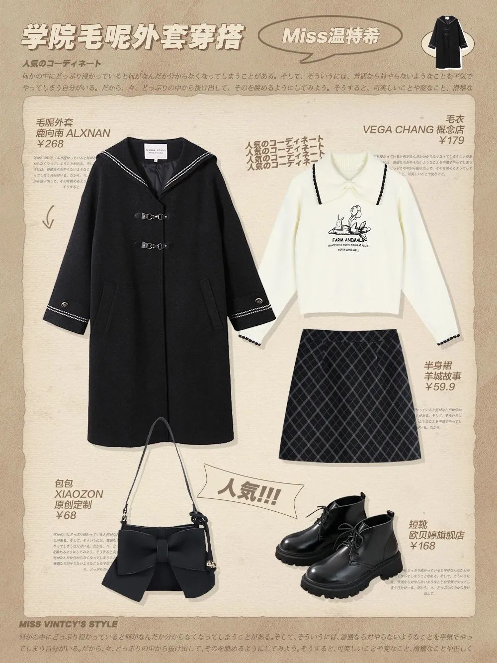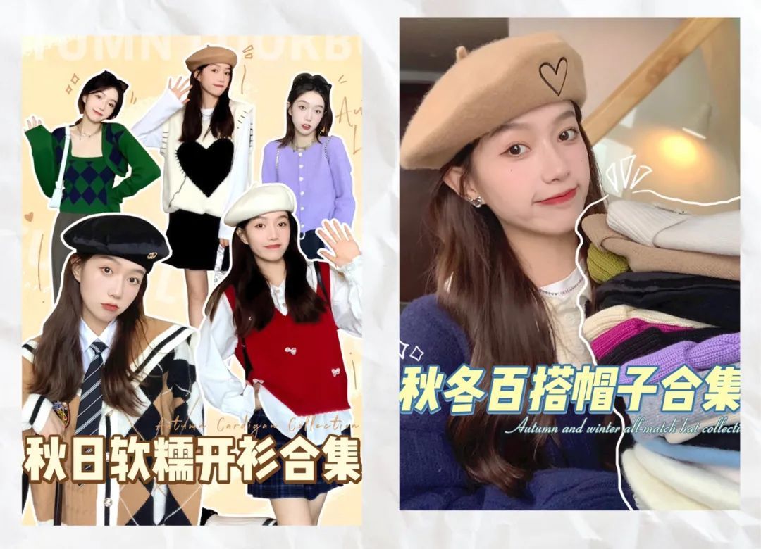 选择的单品剪裁都是基础好搭配的类型,但是 材质、细节设计 又可可爱爱的,比较毛绒材质、学院风的配色、可爱小刺绣等等。