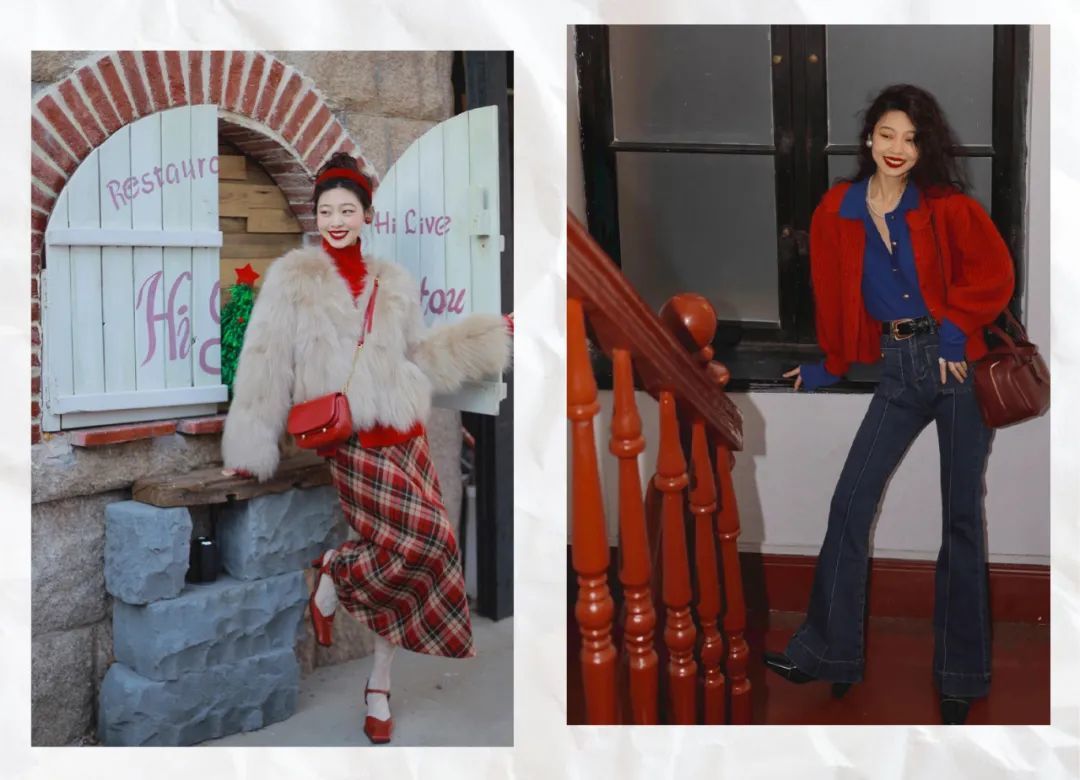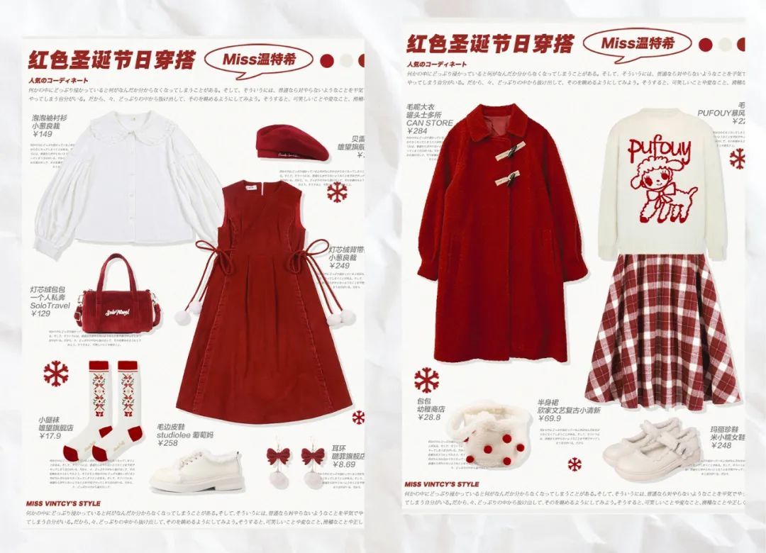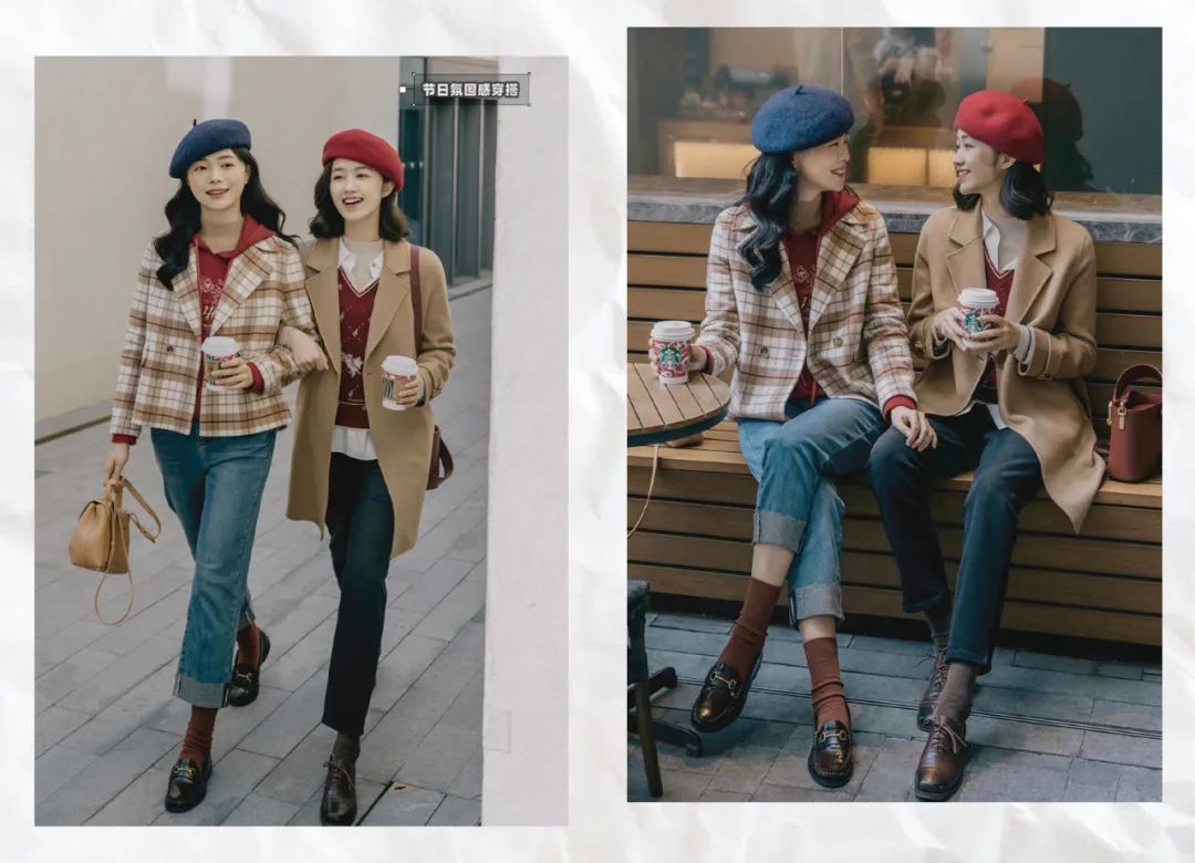 还可以根据 不同的氛围感不同的设定 来进行搭配。比如圣诞节就用红色的营造氛围感,用贝雷帽、毛呢外套来增加复古感。