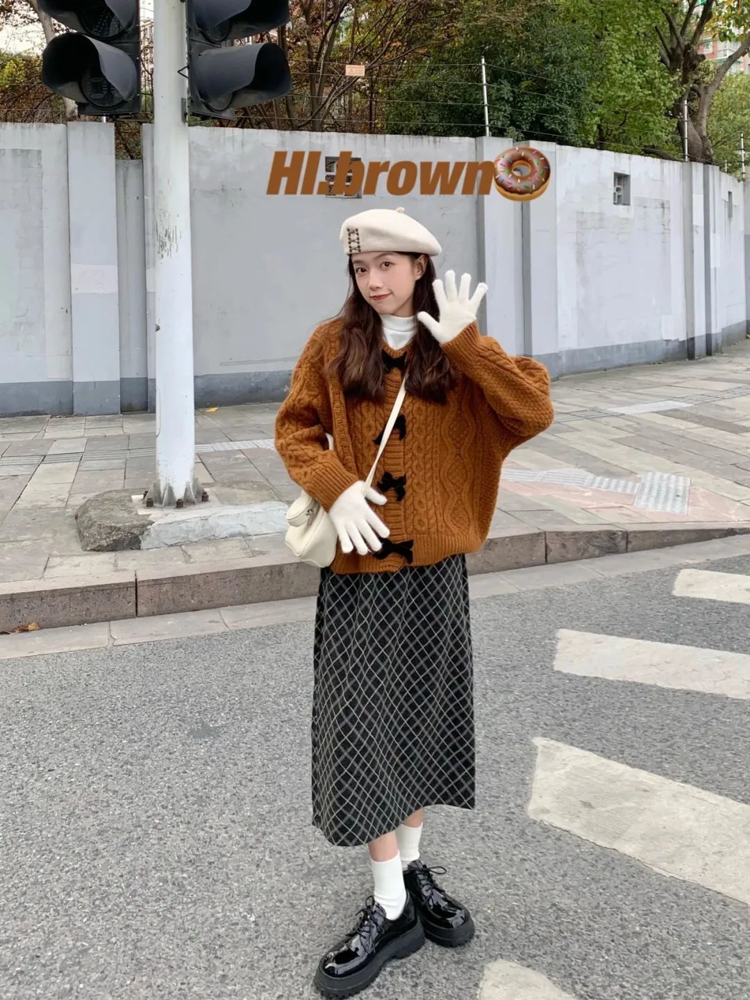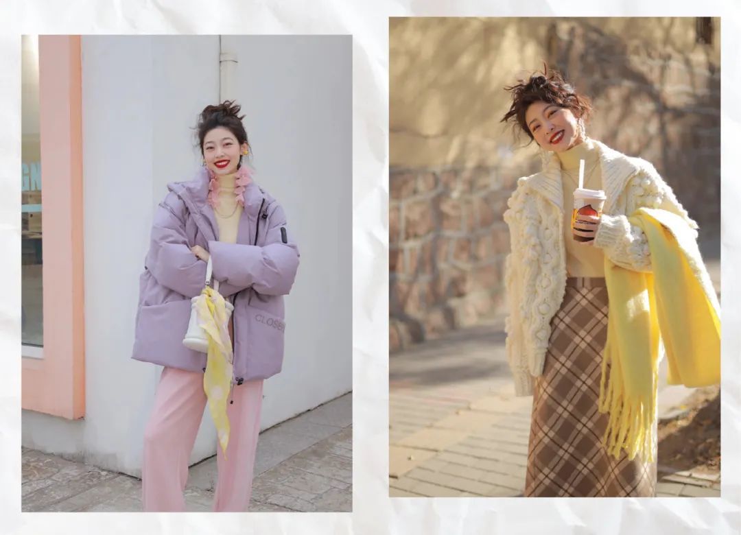 而且也不只有复古风,也有比较少女的嫩色系,看起来奶fufu的,搭配上羊毛卷还挺甜美的。
