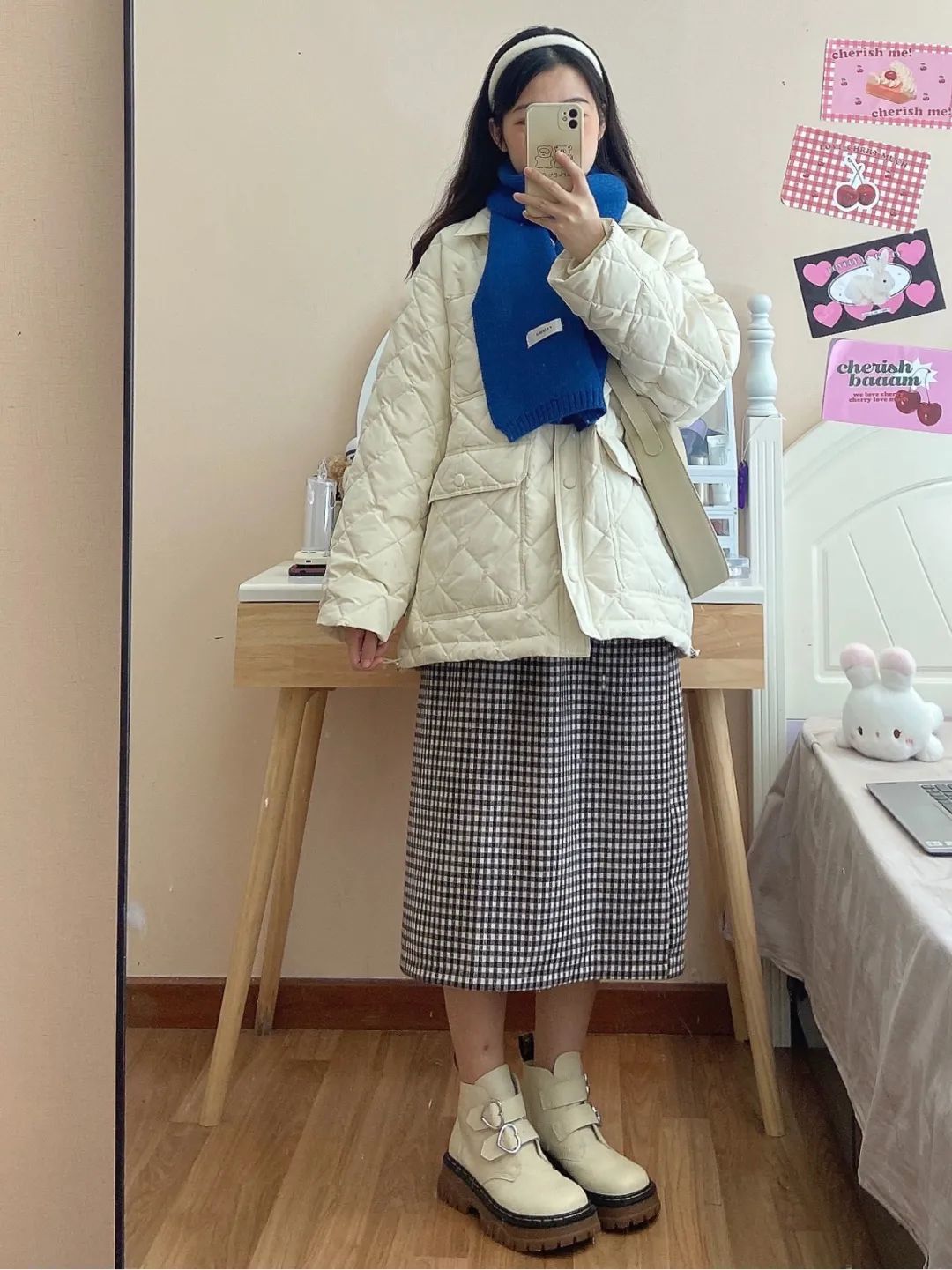 也会分享 一衣多穿的技巧 ,比如同一件百褶裙可以搭配棋盘格针织,可以搭配毛呢大衣,也可以搭配棒球服外套等等。