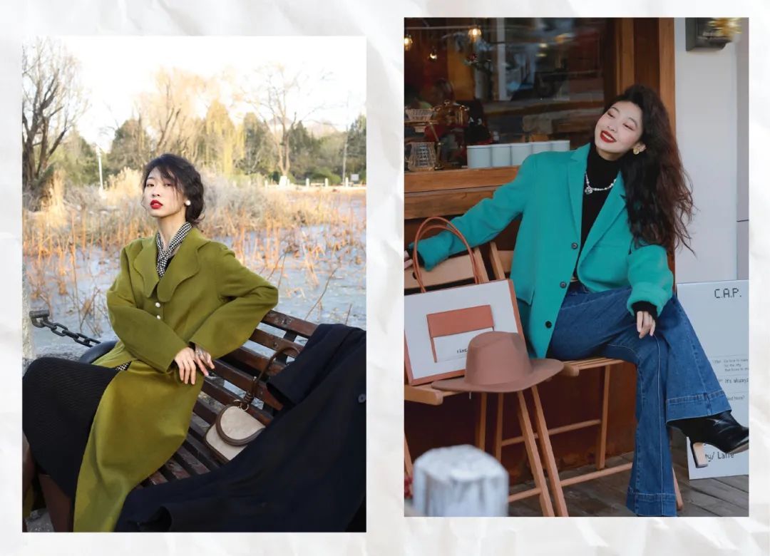 第一位「涂你什么吖」是一个走复古路线的羊毛卷女孩。这位博主的用色还蛮大胆的,很多像橄榄绿、孔雀蓝这种不好驾驭的颜色在她身上都变得超级有味道的!