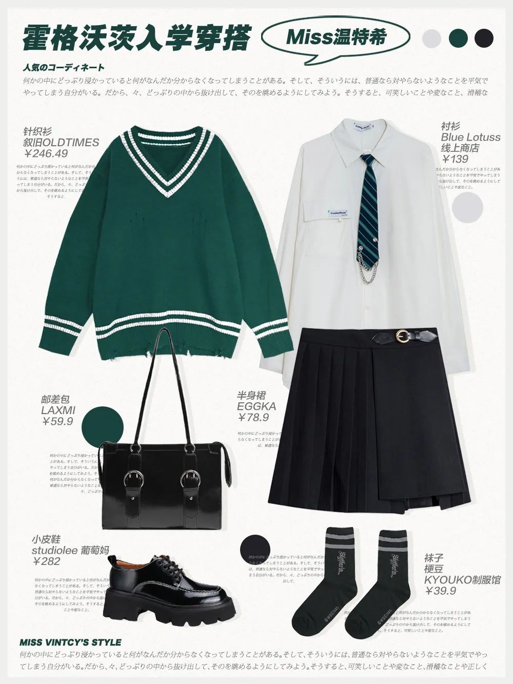 甚至还会设定不同的主题,像是下面这四套,她就是根据近来又火起来的哈利波特四个学院的颜色来进行搭配的。 (绿色蛇院yyds)