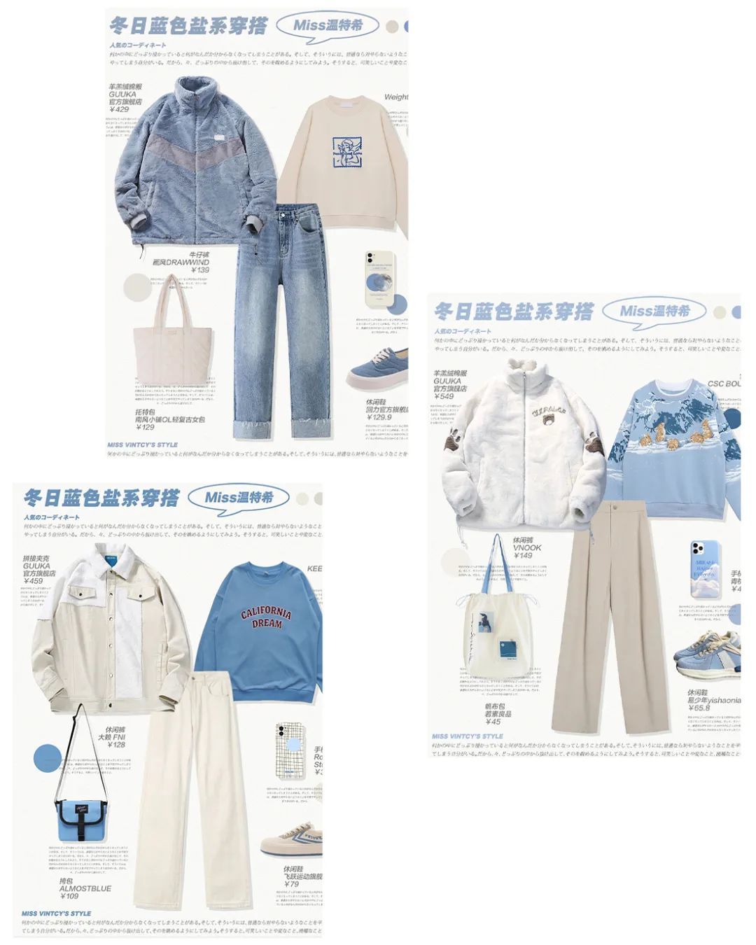 她会按照 不同色系 来分享,比如婴儿蓝色系,挑出单品后进行完整的搭配,不知道怎么搭的姐妹完全可以整套copy!