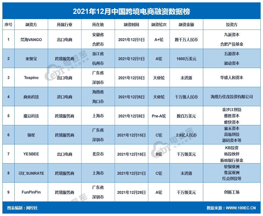 据网经社旗下电商大数据库“电数宝”(DATA.100EC.CN)监测数据显示,2021年12月跨境电商领域共有9家平台及服务商获得融资,分别是FunPinPin、寻汇SUNRATE、YESBEE、领星、魔豆科技、商免科技、Tospino、来赞宝、梵海VANGO,融资总额超5.7亿人民币。