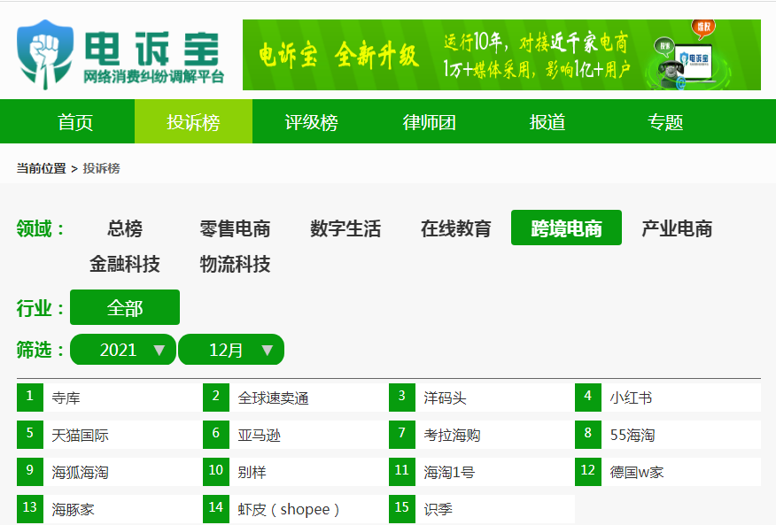 据网经社旗下国内知名网络消费纠纷调解平台“电诉宝”(315.100EC.CN)显示,12月跨境电商领域的投诉事件,按受理投诉量依次为:寺库、全球速卖通、洋码头、小红书、天猫国际、亚马逊、考拉海购、55海淘、海狐海淘、别样、海淘1号、德国W家、海豚家、虾皮(shopee)、识季等。