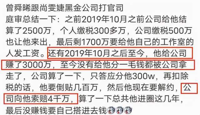 随后,曾舜晞将黑金文化告上了法庭,彼时,大家才知道,曾舜晞入公司后,为公司赚了3000多万,但是他却没分得一毛钱,如果与黑金解约,他反而还得赔偿违约金4000万!