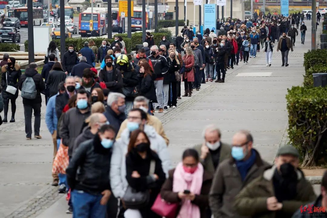 ▲正排队等待接种新冠疫苗的巴塞罗那人
