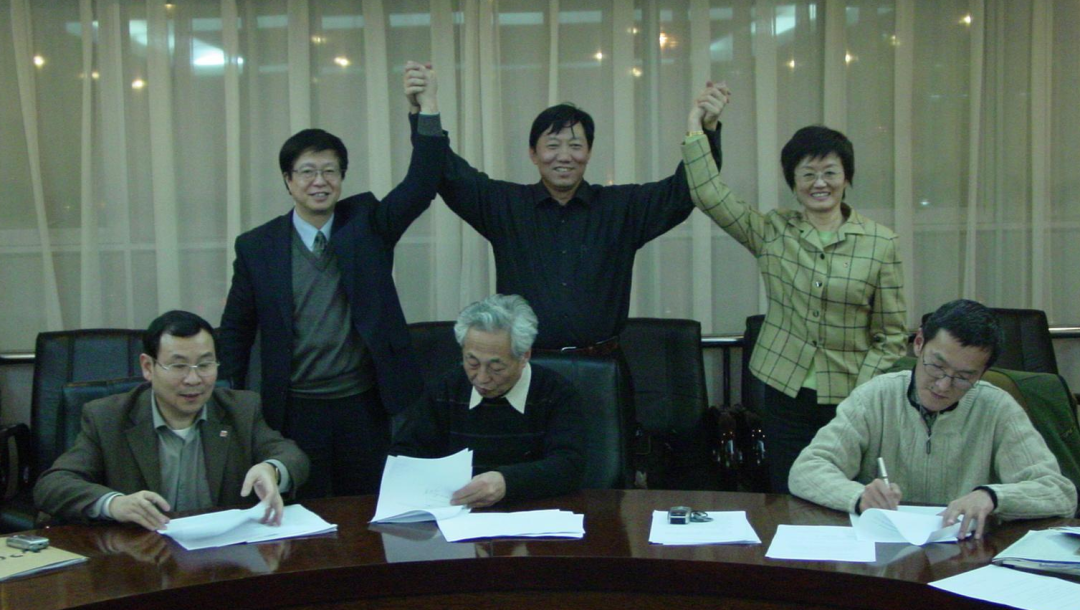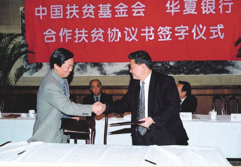 2000年2月1日,中国扶贫基金会与华夏银行合作扶贫协议书签字仪式在全国政协常务会议楼举行。时任中国扶贫基金会秘书长何道峰(左)与华夏银行机关党委书记周英代表双方在协议上签字。