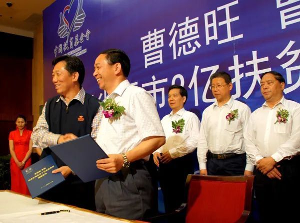 2010年5月20日,企业家曹德旺、曹晖父子以个人名义向西南特大干旱受灾的云南、广西、贵州、重庆、四川5省区市捐赠2亿元扶贫善款。图为时任中国扶贫基金会执行副会长何道峰(前排左)与广西壮族自治区政府副秘书长蒋家柏在捐赠仪式上签约。(图/中国扶贫基金会开心网主页)