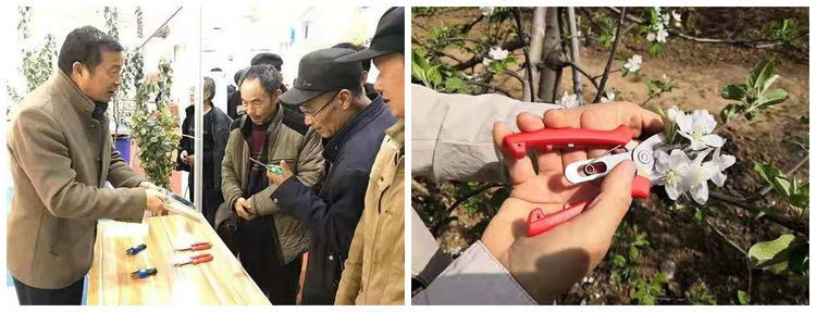 宝鸡市农科院果树研究所技术人员,在服务岐山县多个苹果园区过程中,发现每年果树疏花蔬果时间集中,用工量大,果农负担重。对此,他们大胆尝试、积极钻研,快速研发出了苹果疏花蔬果双口剪刀,并在果园广泛推广使用,效率提高了40%左右。