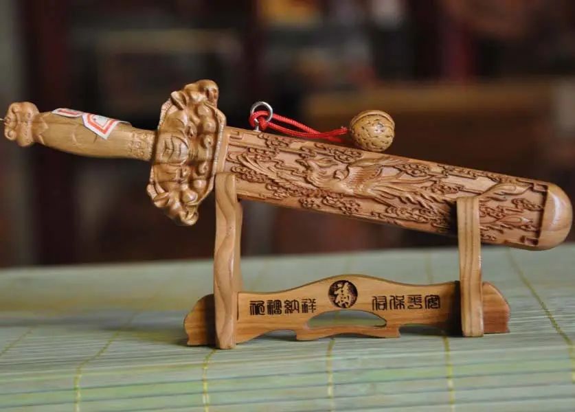 4、剑,古代驱魔师的必备用具,据说神荼、郁垒就是在桃树下捉鬼。桃木有辟邪之气,且有正气。大的桃木剑,小的剑形桃木饰物都具有辟邪之用。