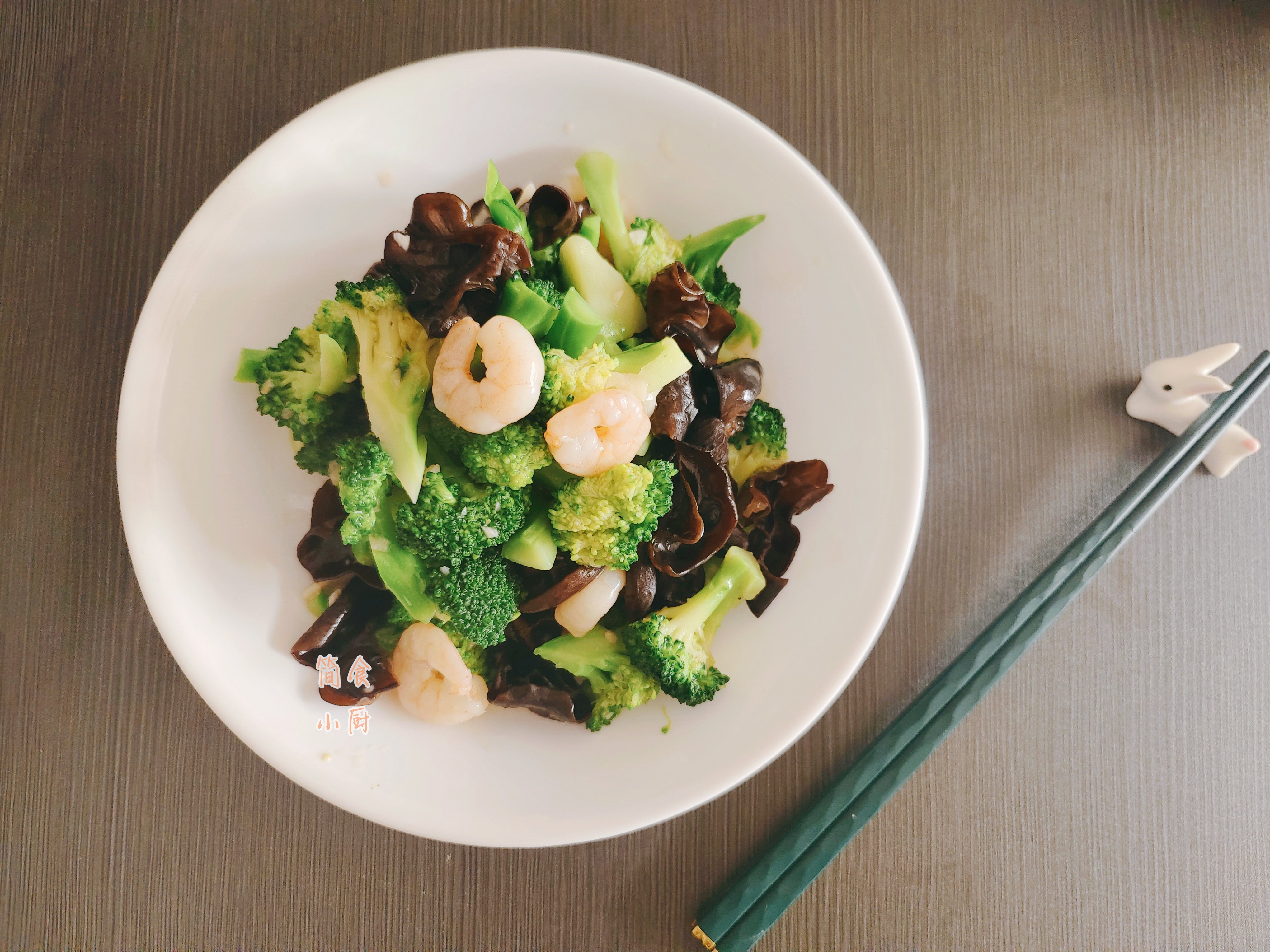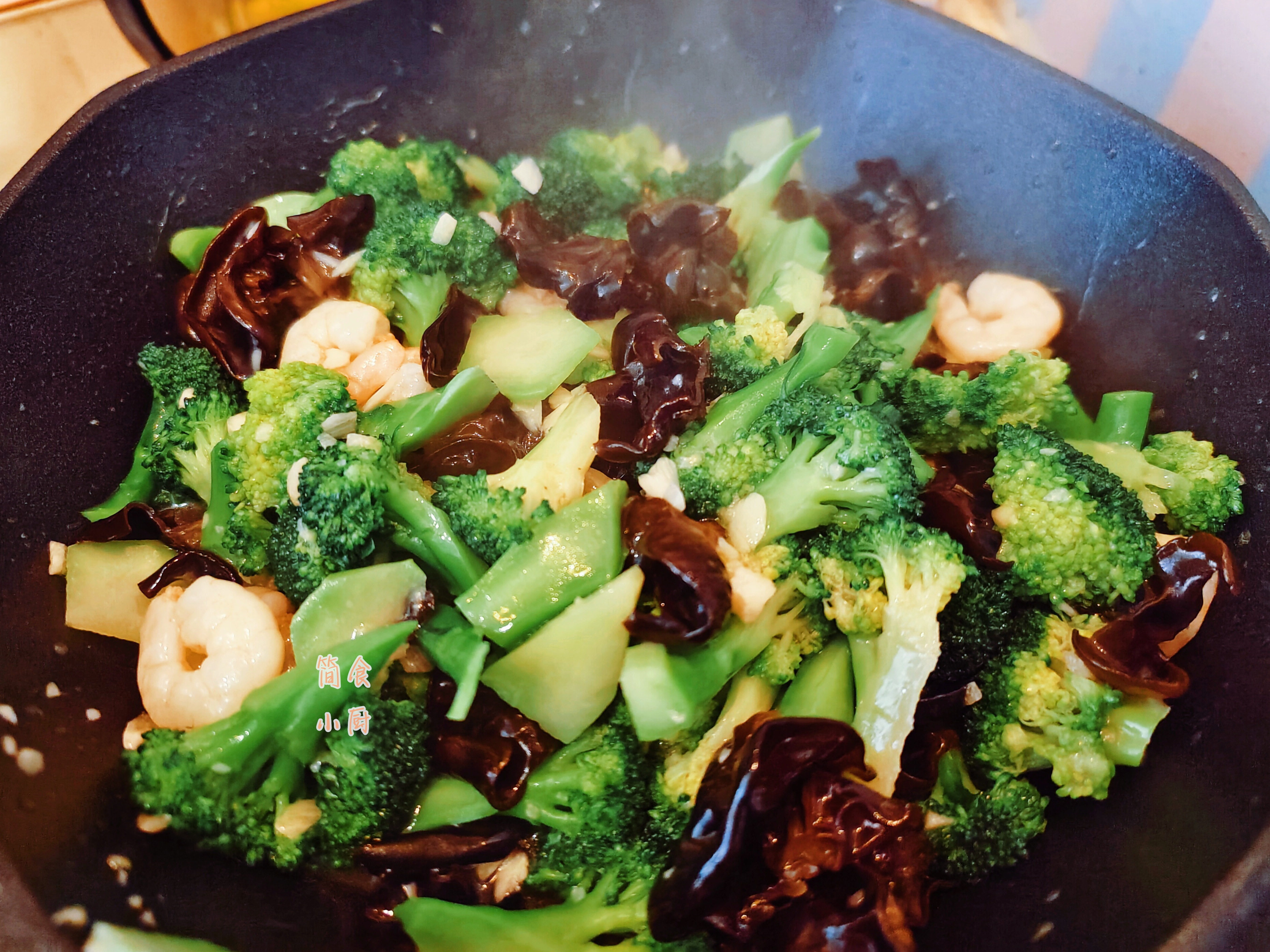 3、起锅烧油,少量食用油即可。先倒入蒜末和虾仁煸炒出香味,且虾仁变色,再倒入烫好的西兰花和木耳,加少许盐、生抽调味,大火快速翻炒30秒即可出锅。