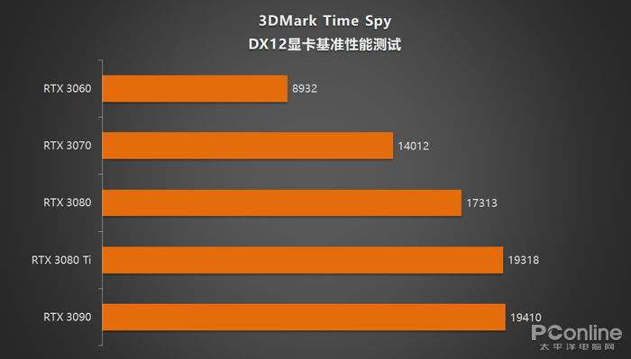 首先测试一波3DMark基准性能测试,Time Spy项目测试可以衡量显卡在DX12环境下的基准性能,从测试结果了解一下这几张显卡的性能情况。