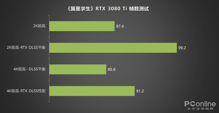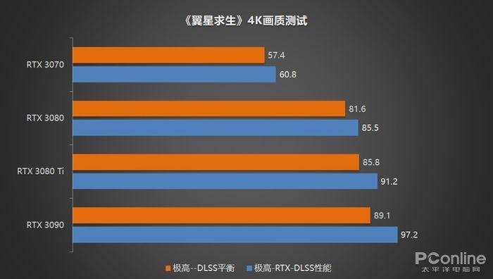 4K分辨率下,不开启光线追踪,启用DLSS-平衡档位,RTX 3090平均帧数为89.1帧,RTX 3080 Ti平均帧数为85.8帧、RTX 3080平均帧数为81.6帧、RTX 3070平均帧数为57.4帧。可以看到RTX 3080及以上的显卡在开启DLSS之后都能够以较高帧率运行,RTX 3070则是建议将DLSS开至性能档位或者降低画质,以获得更高的帧数。