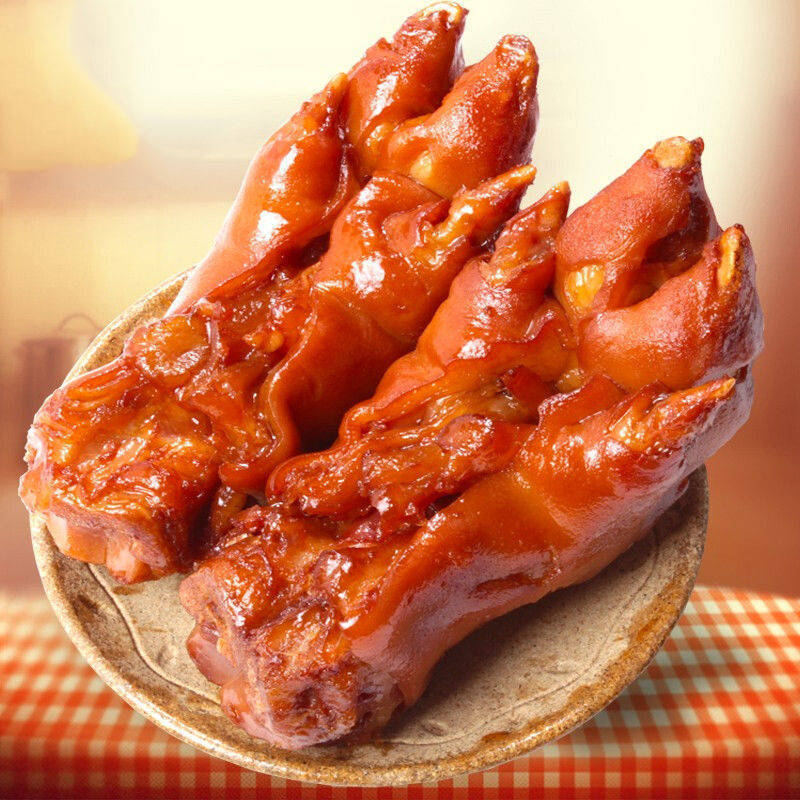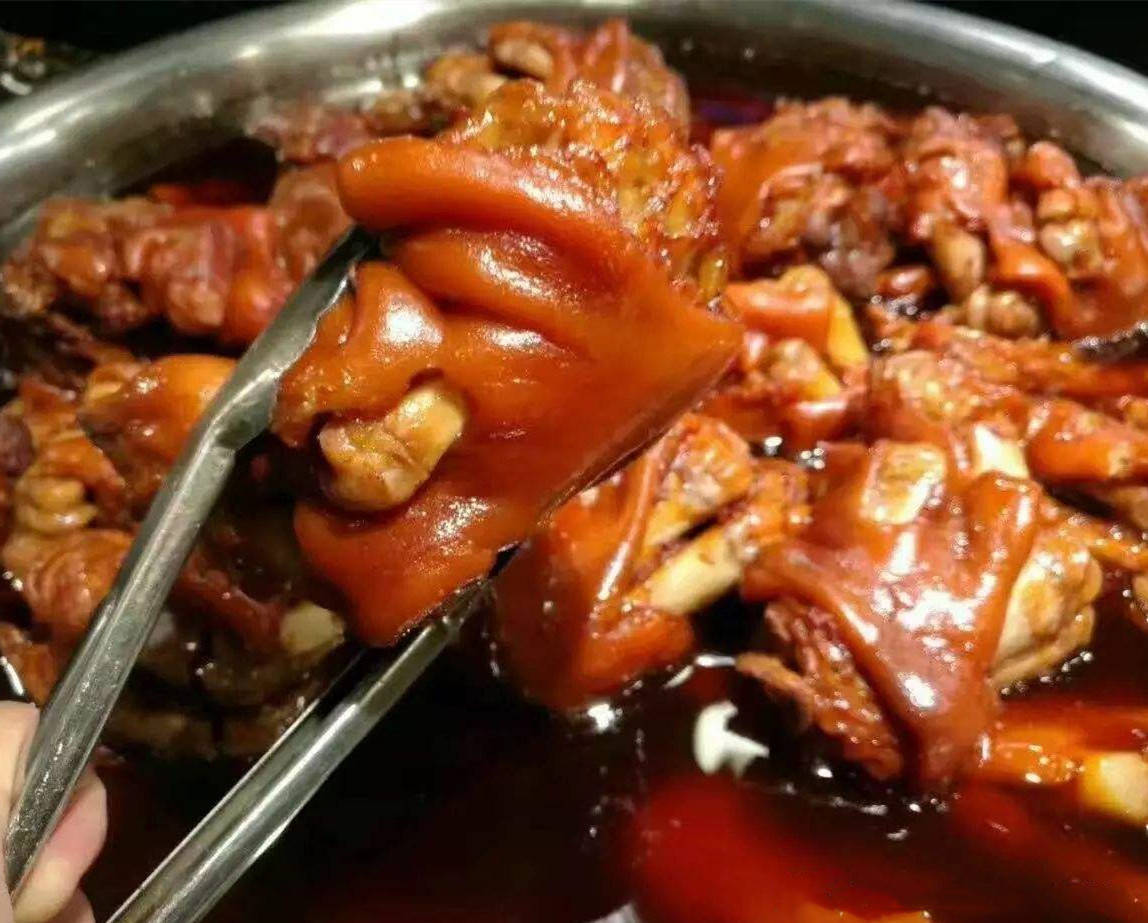 猪蹄9斤、卤水12斤,锅内卤水加热,加入秘料90克(第一锅加180克左右,根据颜色需要增加或减少,以后按标准添加),放入高压锅内料包、生姜片4片,辣椒适量(根据当地口味调整),下入猪蹄上汽30分钟,焖15--20分钟再放气。