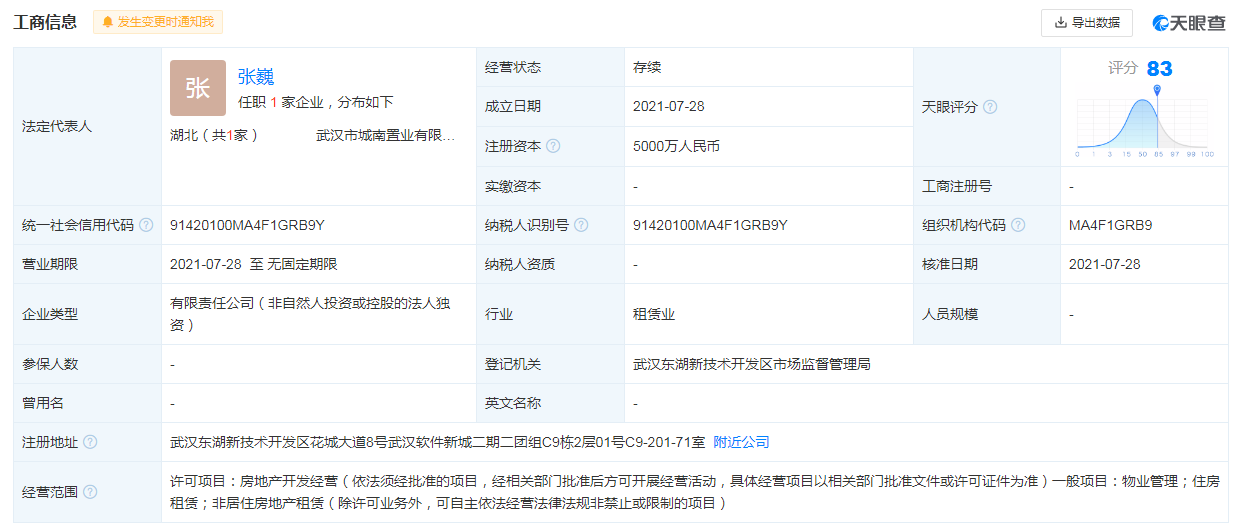 武汉市城南置业有限公司,成立于2021-07-28,注册资本为5000万人民币,注册地址为武汉东湖新技术开发区花城大道8号武汉软件新城二期二团组C9栋2层01号C9-201-71室,经营范围包括许可项目:房地产开发经营;物业管理;住房租赁;非居住房地产租赁。
