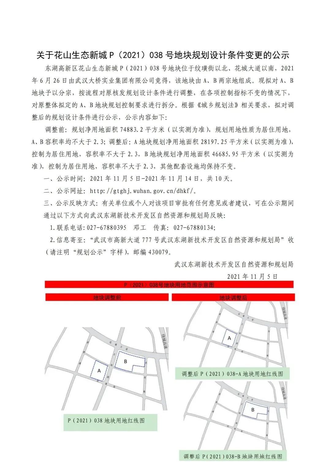 同年11月5日,武汉市自然资源和规划局东湖新技术开发区分局,发布花山生态新城P(2021)038号地块规划设计条件变更公示。根据公示内容,P(2021)038号地块由A、B两宗地构成,计划在各项控制指标不变的情况下,拟对A、B地块规划予以拆分。