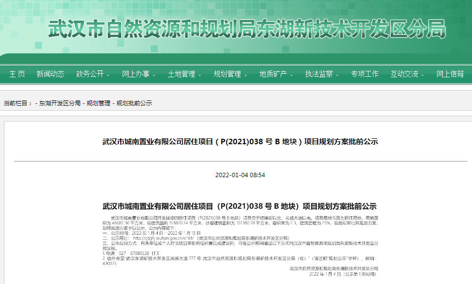 乐居买房讯 佟雯雯 近日,武汉市自然资源和规划局东湖新技术开发区分局公示了武汉市城南置业有限公司居住项目(P(2021)038号B地块)项目规划方案。