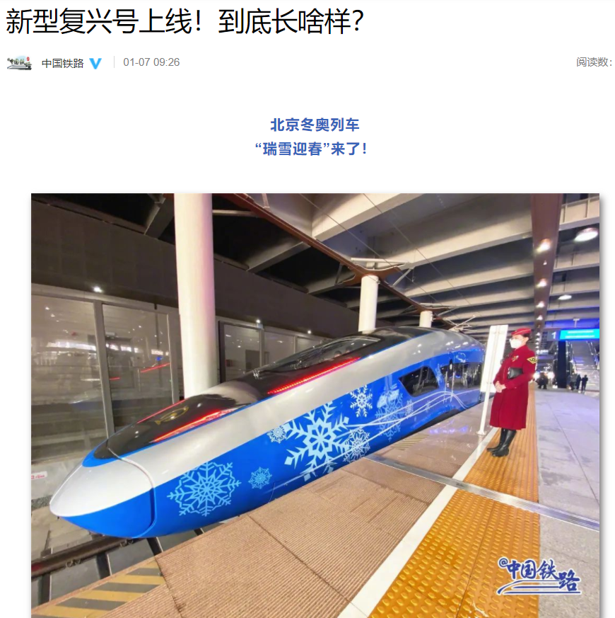 从图中可以看到,“瑞雪迎春”复兴号列车采用了蓝色、银色搭配,车头印有雪花图案,非常符合冬奥的气氛。