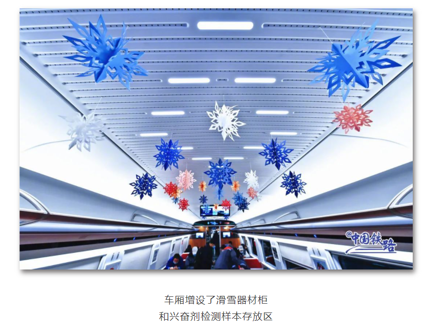此外,列车内部也配备了冬奥装饰,智能环境感知调节技术能实现车内温度、灯光和车窗颜色等功能的自动调节。