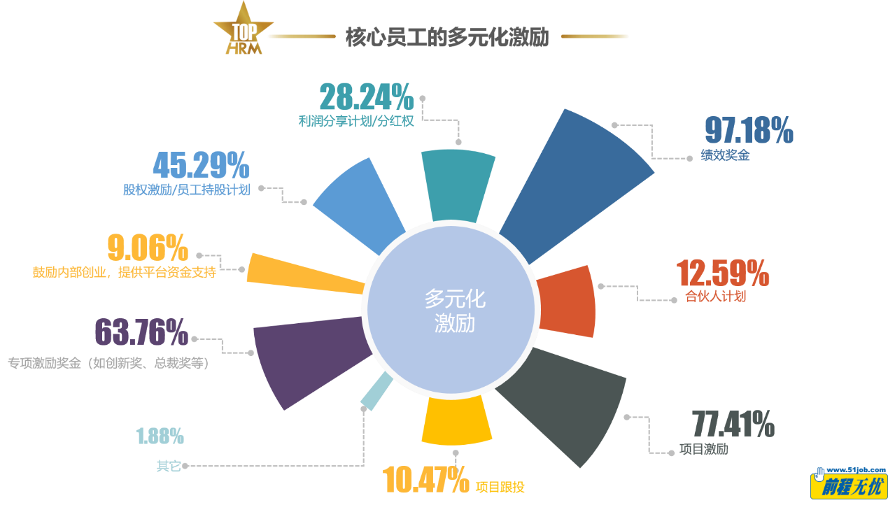 在员工激励方面,除了传统的绩效资金、项目激励外,还专门设立了专项激励奖金如创新奖、总裁奖,四成企业推出了员工持股计划和利润分红,还有10.47%的企业设立“项目跟投”,让员工有机会真正实现与企业利益的捆绑共享。