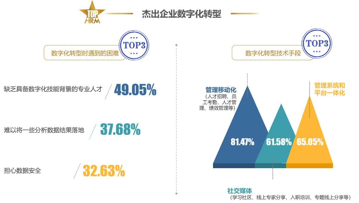 人力资源数字化先行,是驱动业务运营升级、组织全面转型的突破口。人才招聘、员工考勤、人才管理、绩效管理等的人力资源管理移动化是企业用到最多的技术手段(81.47%),人力资源管理系统和平台一体化(65.05%)和社交媒体(学习社区、线上专家分享、入职培训、专题线上分享等)(61.58%)分列二三位;而“缺乏具备数字化技能背景的专业人才”成为企业数字化转型时遇到的最大困难(49.05%)。