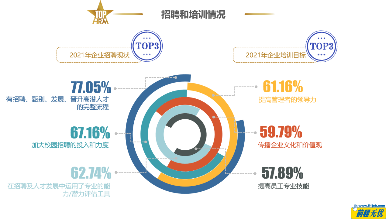 企业需要新鲜血液,更需要符合企业需求的人。企业在招聘过程中,为了进一步精准筛选候选人,对于面试中采用的甄选工具和方式除传统外线下面试外,分别有五成以上的企业选择了背景调查和量表测评。在被问及2021年的招聘现状时,绝大部分获奖企业有招聘、甄别、发展、晋升高潜人才的完整流程,此外,加大校园招聘的投入和力度、在招聘及人才发展中运用了专业的能力/潜力评估工具也在获奖企业中普遍存在。
