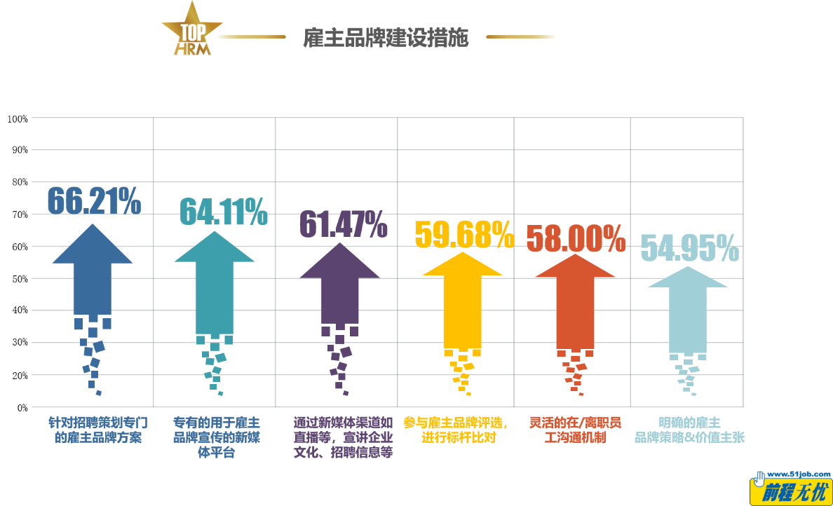 上述这些行动,均是企业雇主品牌建设的重要方面。通过调研发现,超过6成的杰出企业会针对招聘,策划专门的雇主品牌方案、打造专有的用于雇主品牌宣传的新媒体平台,通过新媒体渠道如直播等宣讲企业文化、招聘信息、社会活动等,由此可见,重视雇主品牌打造几乎成为杰出企业的“标配”。