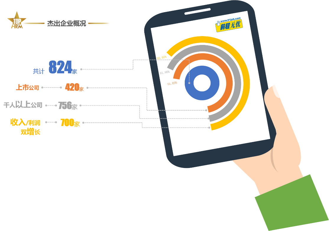 近日,2022前程无忧人力资源管理杰出奖评选结果揭晓,全国10个区域的824家企业最终上榜。民营企业数量依然最多,共323家,占总数的39.20%;国有企业230家,外资企业131家,合资企业76家,其它性质企业64家。获奖企业中有420家上市公司,员工总数在千人以上的大型企业有756家,员工数超过3000人的超大型企业502家。