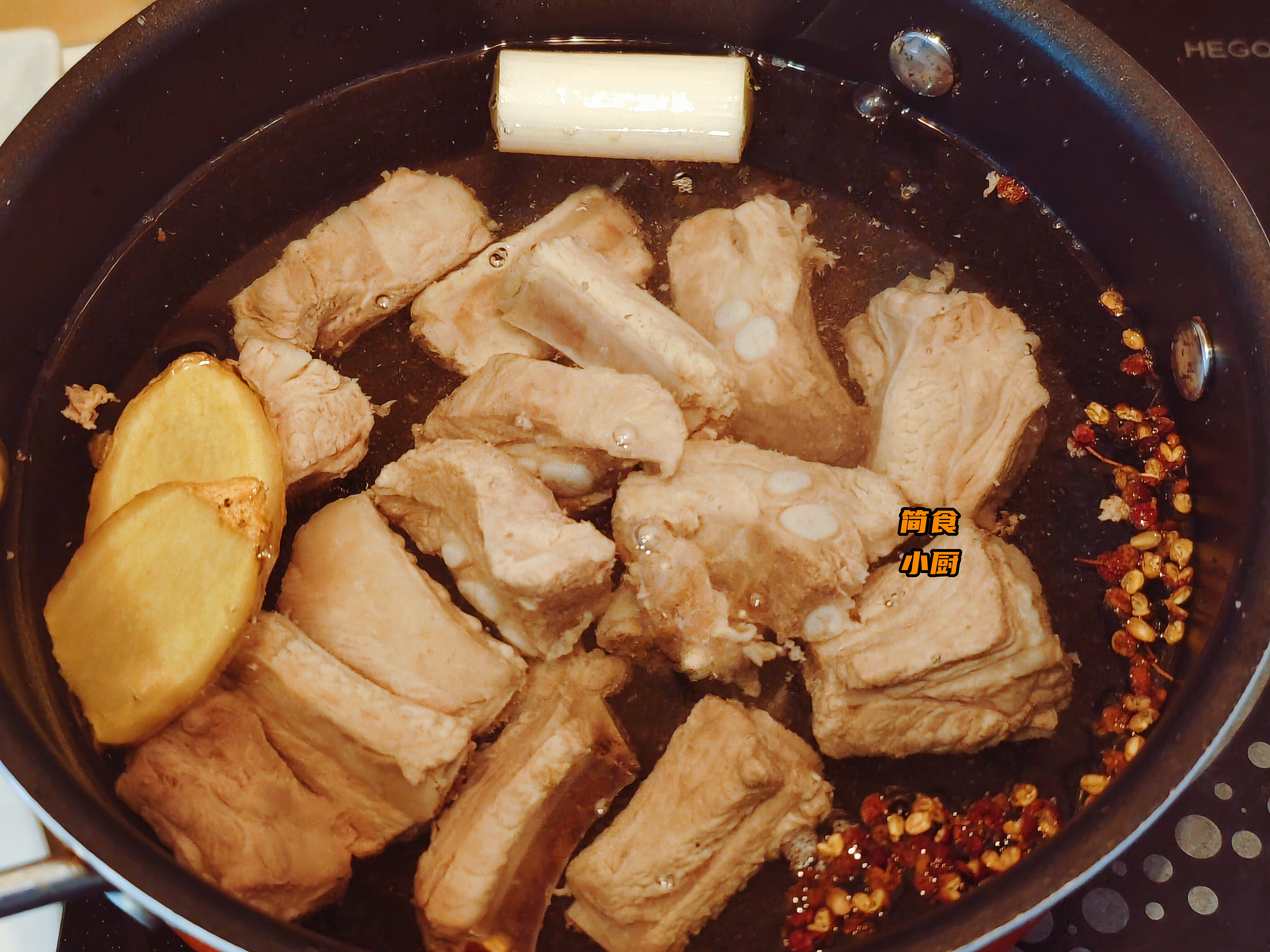 2、将冲洗干净的排骨及葱段、姜片、一小把花椒粒放入锅中,倒入足量的开水、10g料酒、2g白胡椒粉,大火烧开后转小伙继续炖煮1小时左右。