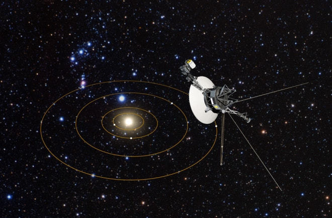 完成了最初被赋予的使命后,探测器的动量(即物体在它运动方向上保持运动的趋势)将会继续推动它们自身驶离太阳系并最终抵达宇宙浩瀚无垠的群星之列。正因如此,有四枚探测器上携带有“地球名片”,若有朝一日,外星智慧生物读到了这些“名片”,它们便能获取探测器发明者,也就是我们人类的信息了。一般认为,一旦探测器到达了星际空间,就代表它们已经离开了太阳系。根据NASA(美国国家航空航天局)的说法,“太阳风”被“星际介质”阻碍的地方就是星际空间,“太阳风”是日冕因高温膨胀,不断抛射到行星际空间的等离子流体,“星际介质”则是存在于星系内恒星与恒星之间的物质与辐射。