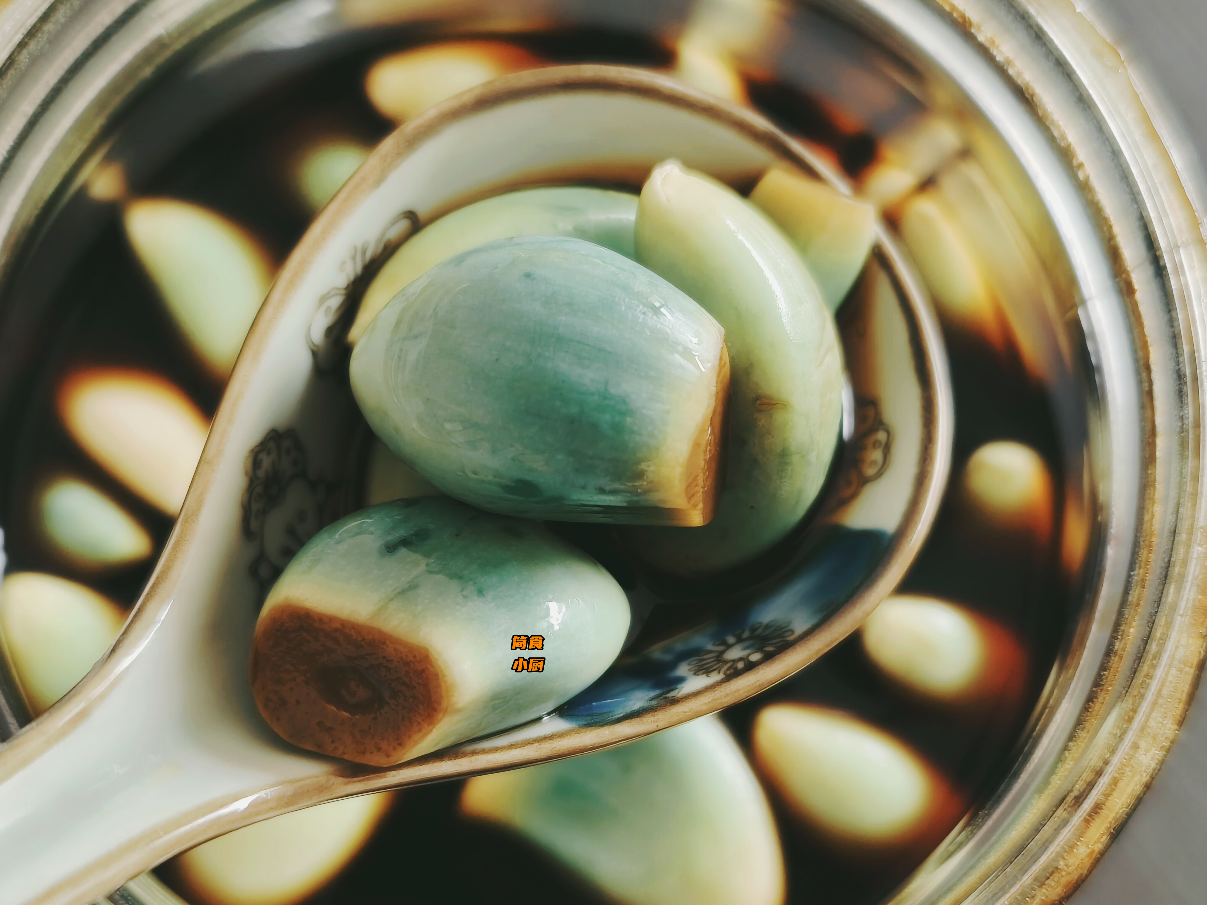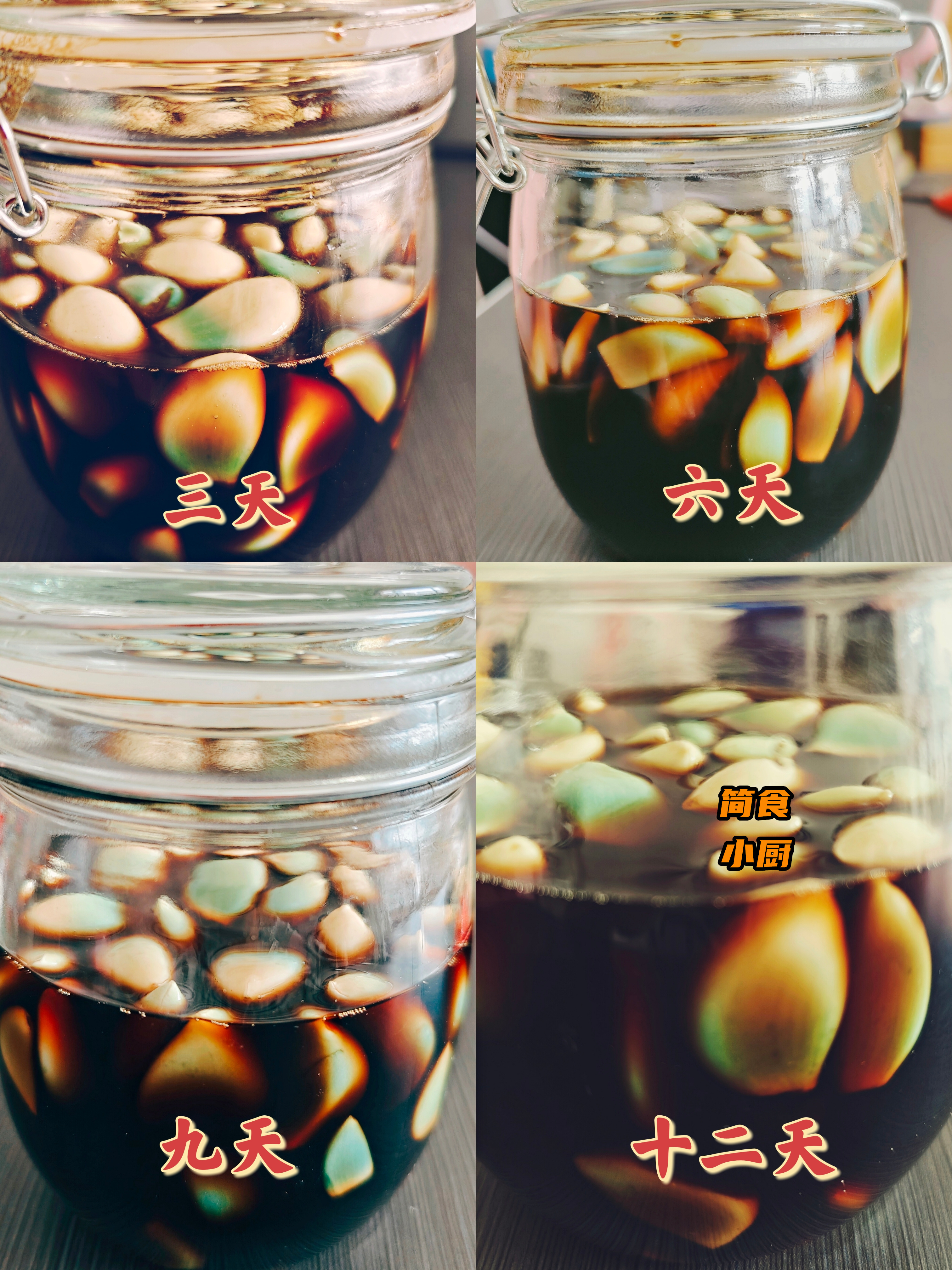记录了腊八蒜的变色过程,几乎已经全绿了。腌制好的腊八蒜开盖的时候香气扑鼻,蒜瓣碧绿似翡翠,醋是酸中带甜,甜中带辣,赶快动手做起来吧,放到除夕和家人一起享用。