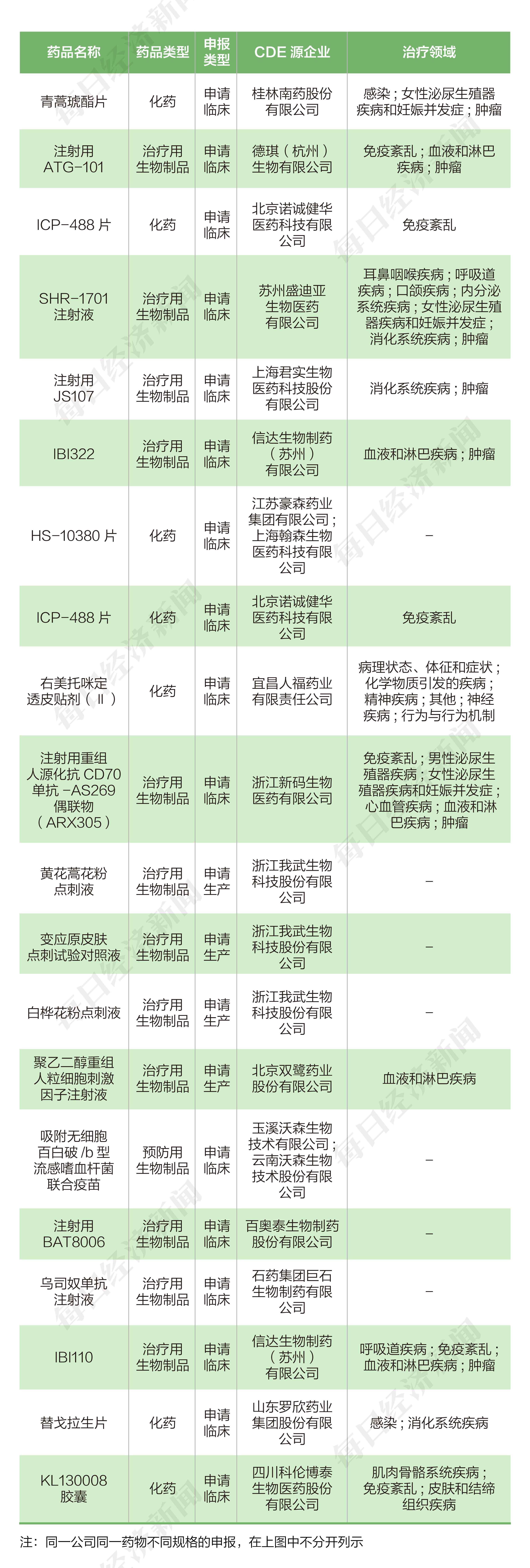 本周上市公司方面,我武生物(300357.SZ)共申报3个生产申请;双鹭药业(002038.SZ)共申报2个生产申请;诺诚健华-B(09969.HK)、翰森制药(03692.HK)、科伦药业(002422.SZ)各申报3个临床申请;信达生物(01801.HK)申报2个临床申请;复星医药(600196.SH)、德琪医药-B(06996.HK)、恒瑞医药(600276.SH)、君实生物-U(688180.SH)、人福医药(600079.SH)、浙江医药(600216.SH)、沃森生物(300142.SZ)、百奥泰-U(688177.SH)、石药集团(01093.HK)、罗欣药业(002793.SZ)各申报1个临床申请。