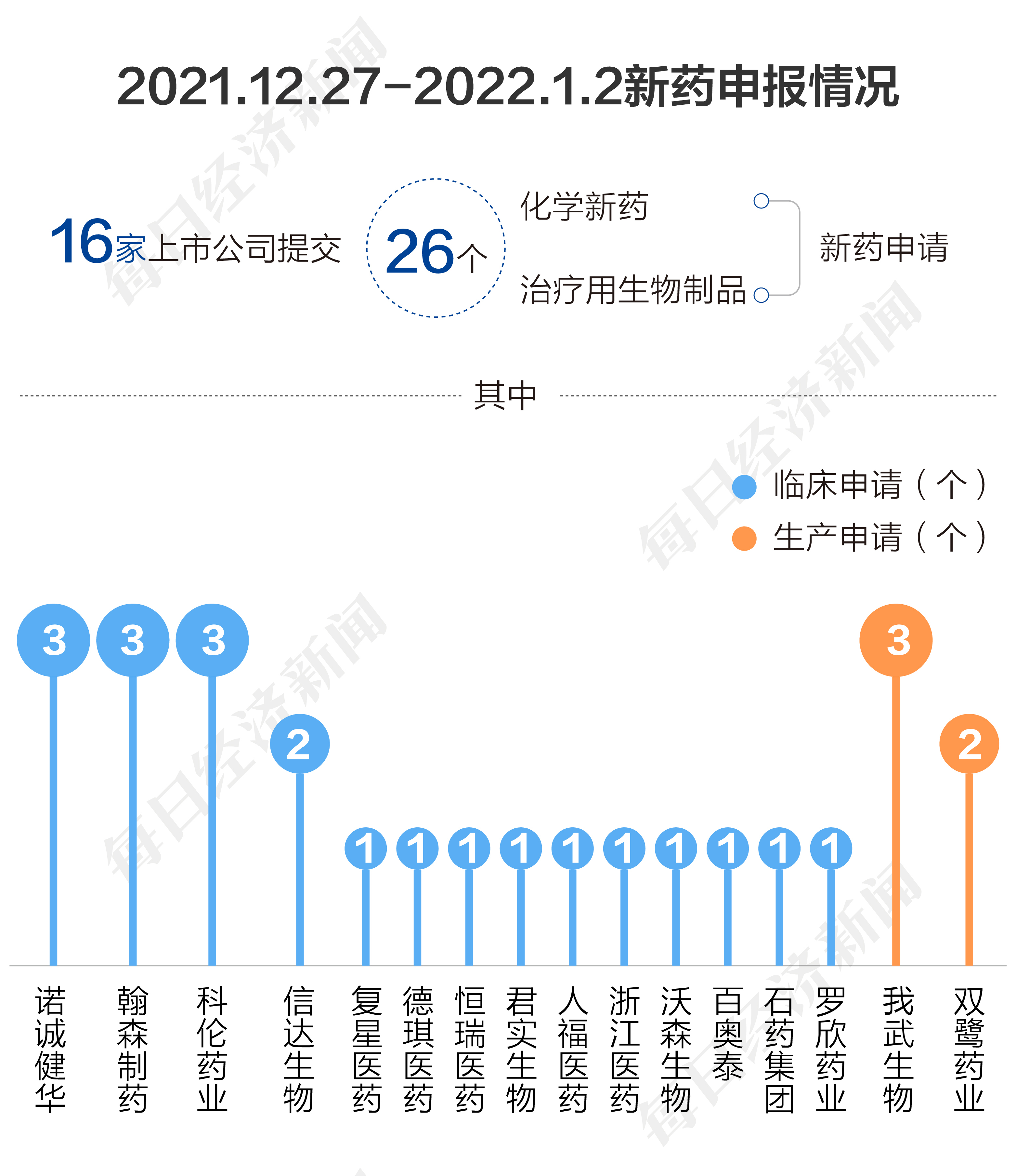 根据药渡数据,2021年最后一周(2021年12月27日至2022年1月2日),国家药品监督管理局药品审评中心(CDE)共收到16家上市公司(含上市公司控股公司)提交的26个化学新药、治疗用生物制品新药申请。