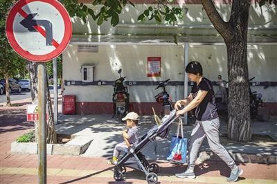 2021年8月27日,朝阳区建东苑社区的一名居民推着婴儿车走过电动自行车充电棚。新京报记者 王远征 摄