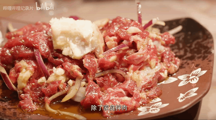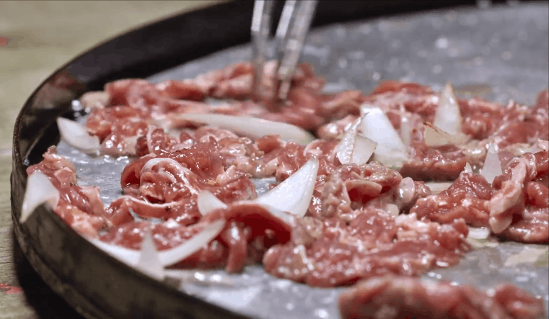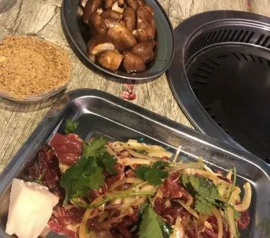 新鲜牛肉现切大块,和调料一起放不锈钢盆里用手抓匀,再架烤炉烧炭火,用牛油润锅擦拭,把拌好的肉铺开烤到卷边,最后蘸干料碟。