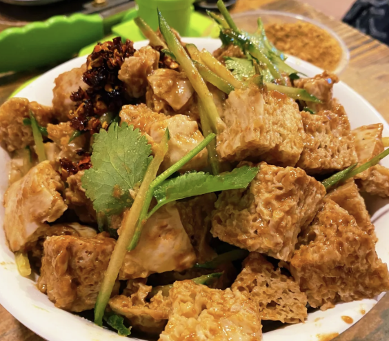 必点的豆皮、大头菜、毛肚、豆腐泡供不应求,拿出来在自己的蘸碟里滚两下,趁热嘶哈着吞进去,麻辣料又香又麻,蘸料回味浓厚。