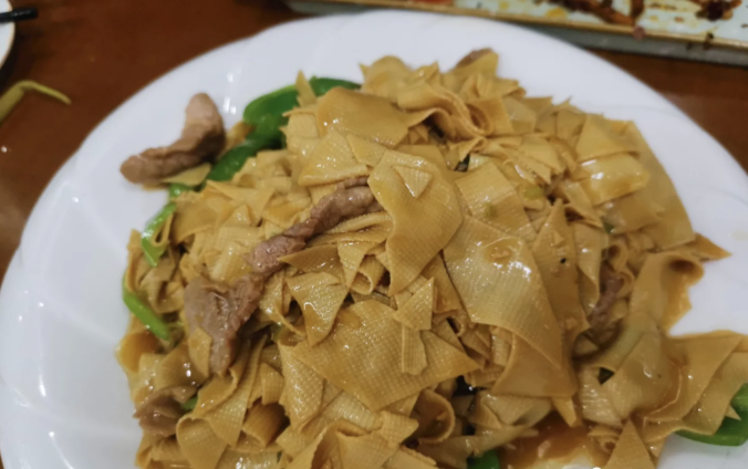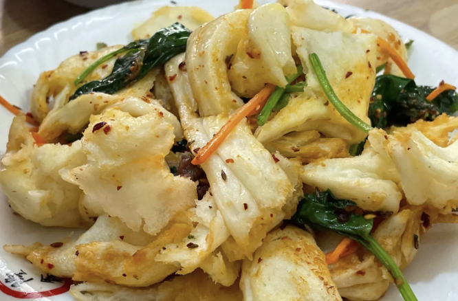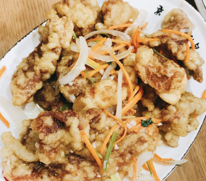 锅包肉是老式的 ,炸过之后依然软硬适中,浓郁的酱汁溢在盘底,吃起来偏酸甜。和炒花卷一起,一甜一咸的搭配可以给满分。