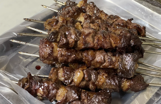 齐市人吃烤串延续了大片肉的精髓,改为 大肉串 。个头超大, 几大块肉串成一串 ,被塞得满满的。