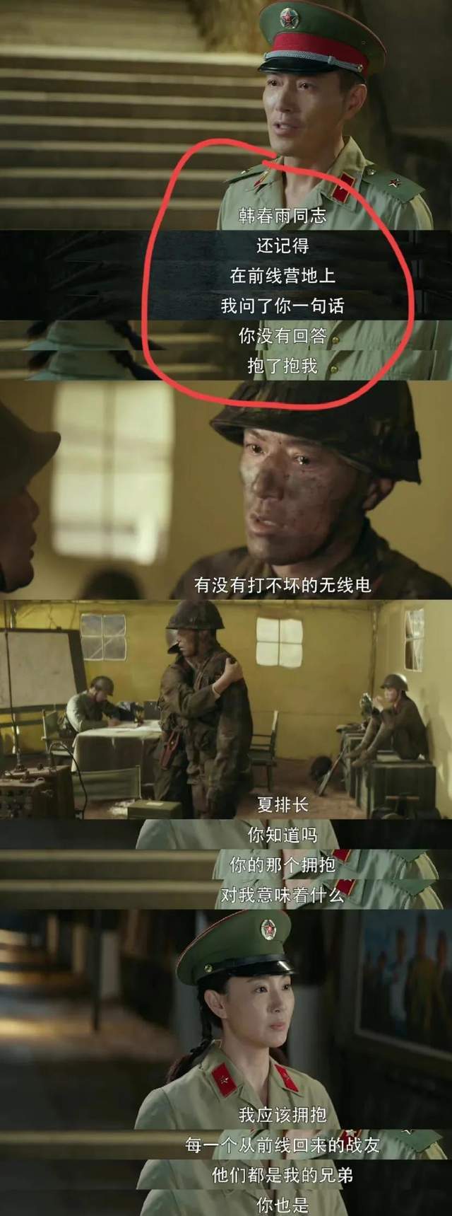 韩春雨班长把自己争先创优的名额,让给江南征;她在战场上是江南征的贴心姐姐,好战友;生活中帮她排忧解难;看着她在被顾一野分手之后伤心痛苦,看着她后来面对高粱的左躲右闪,痛苦不已,韩春雨永远都是站在江南征身边,温暖陪伴她的那个大姐姐。