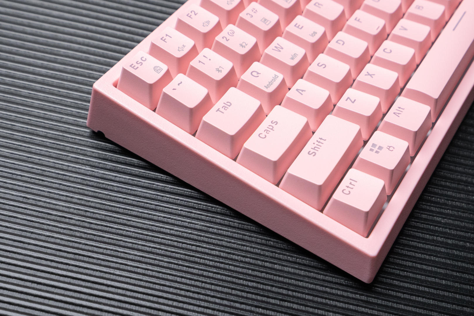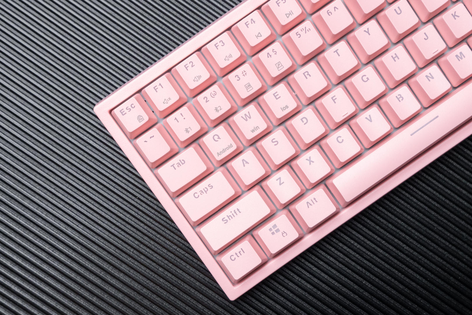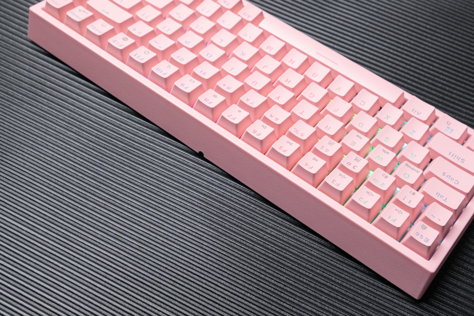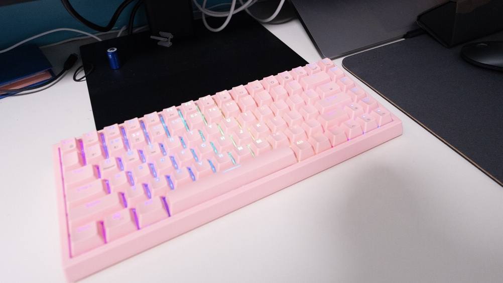 这款机械键盘的配色有两种,我选择的是猛男粉,本人对于粉色是完全没有抵抗力的。同时轴体分为青轴、红轴、茶轴三种,我选择了表现比较均衡和全面的茶轴。键盘机身外壳采用的是ABS材质,键帽采用高含量PBT材料,同时用了先进的处理工艺,摸上去手感极佳,长时间使用仍然可以保持字符的清晰度和清爽的手感。
