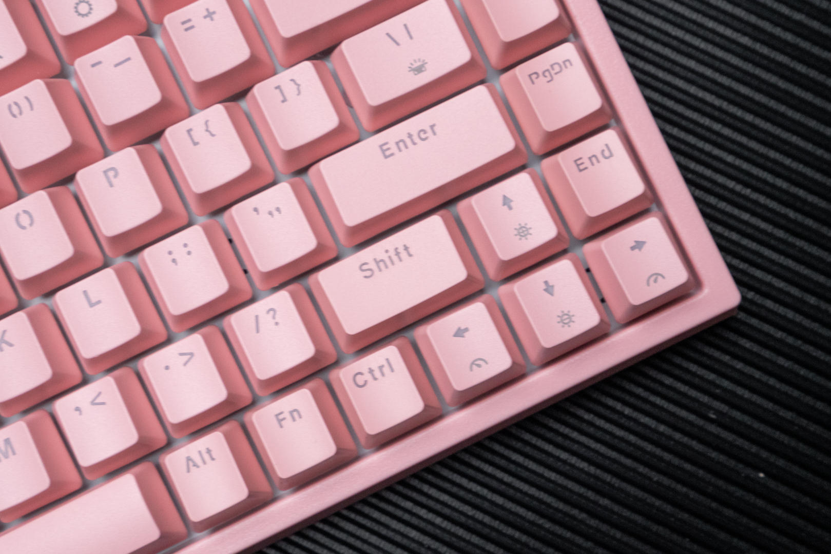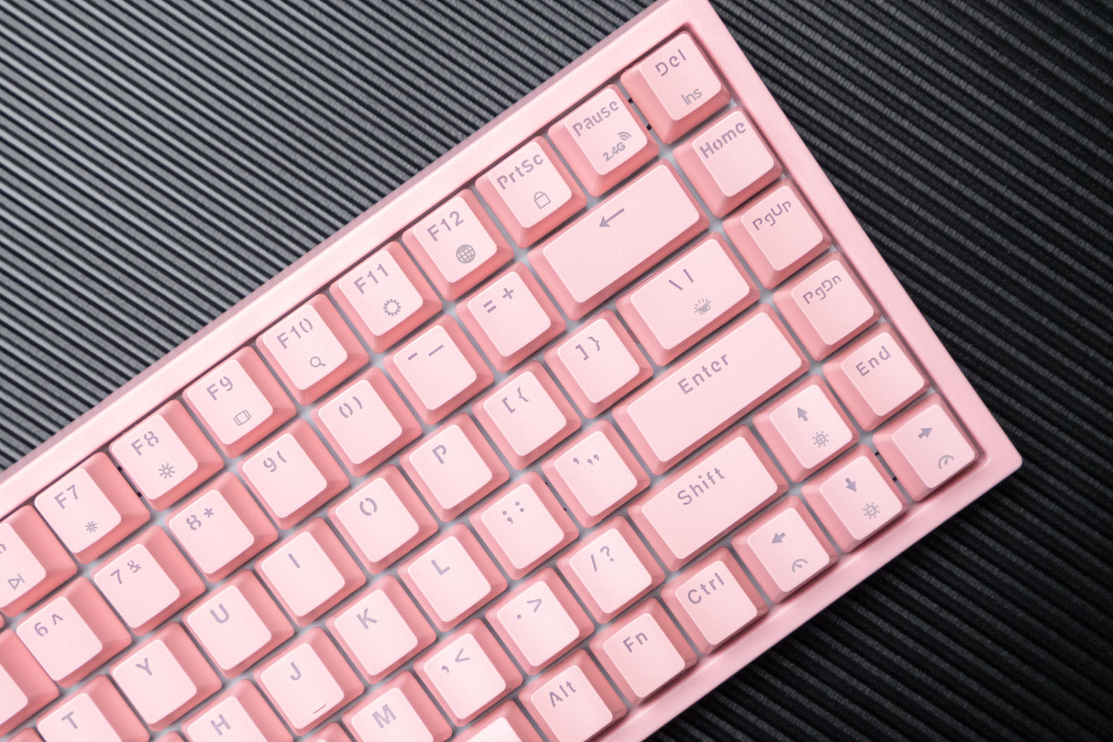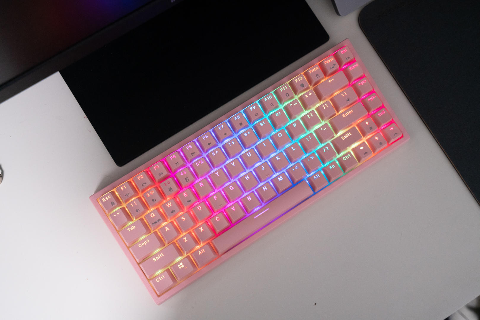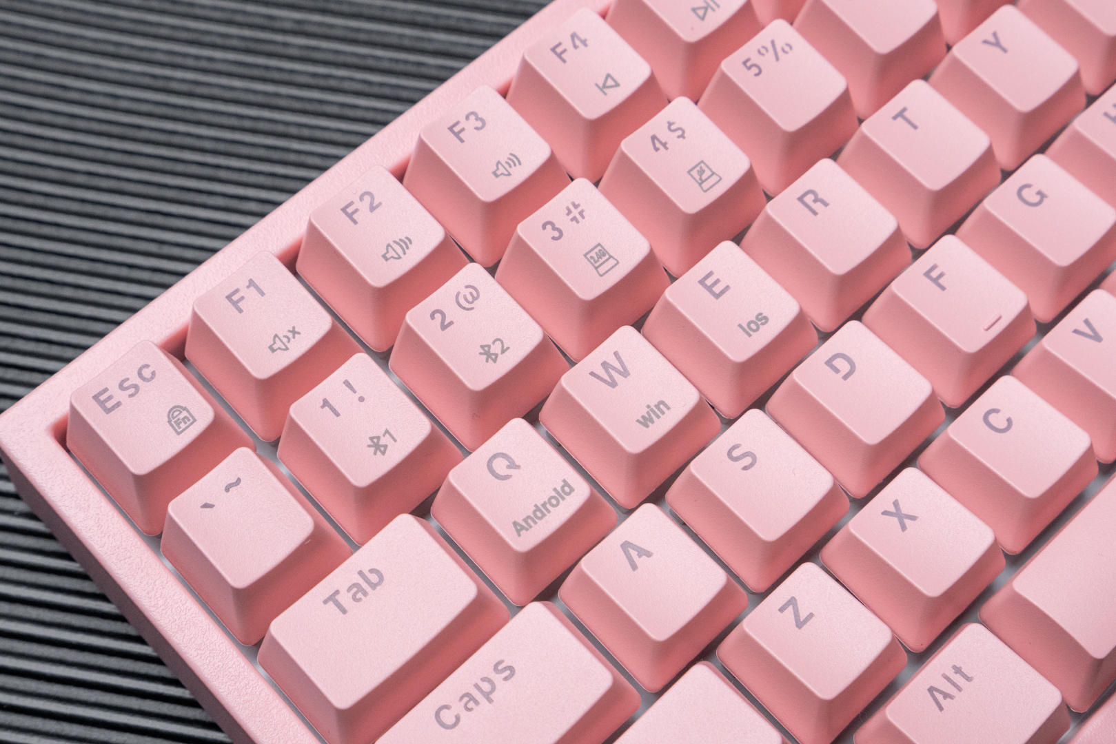 这款机械键盘的配色有两种,我选择的是猛男粉,本人对于粉色是完全没有抵抗力的。同时轴体分为青轴、红轴、茶轴三种,我选择了表现比较均衡和全面的茶轴。键盘机身外壳采用的是ABS材质,键帽采用高含量PBT材料,同时用了先进的处理工艺,摸上去手感极佳,长时间使用仍然可以保持字符的清晰度和清爽的手感。