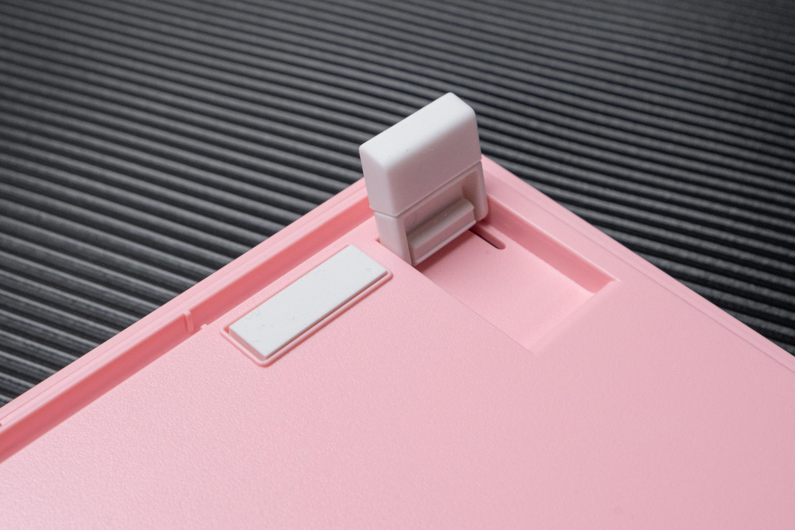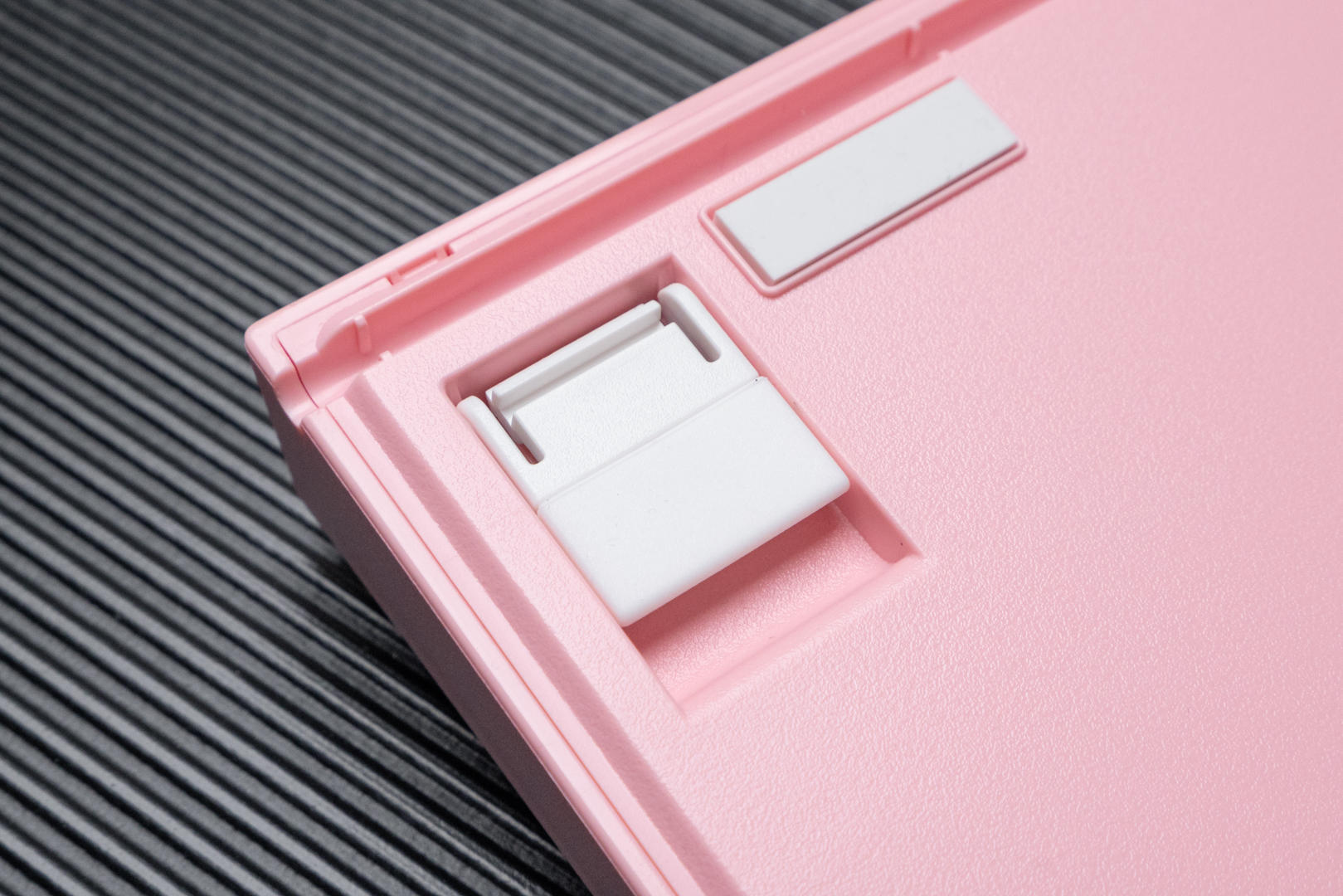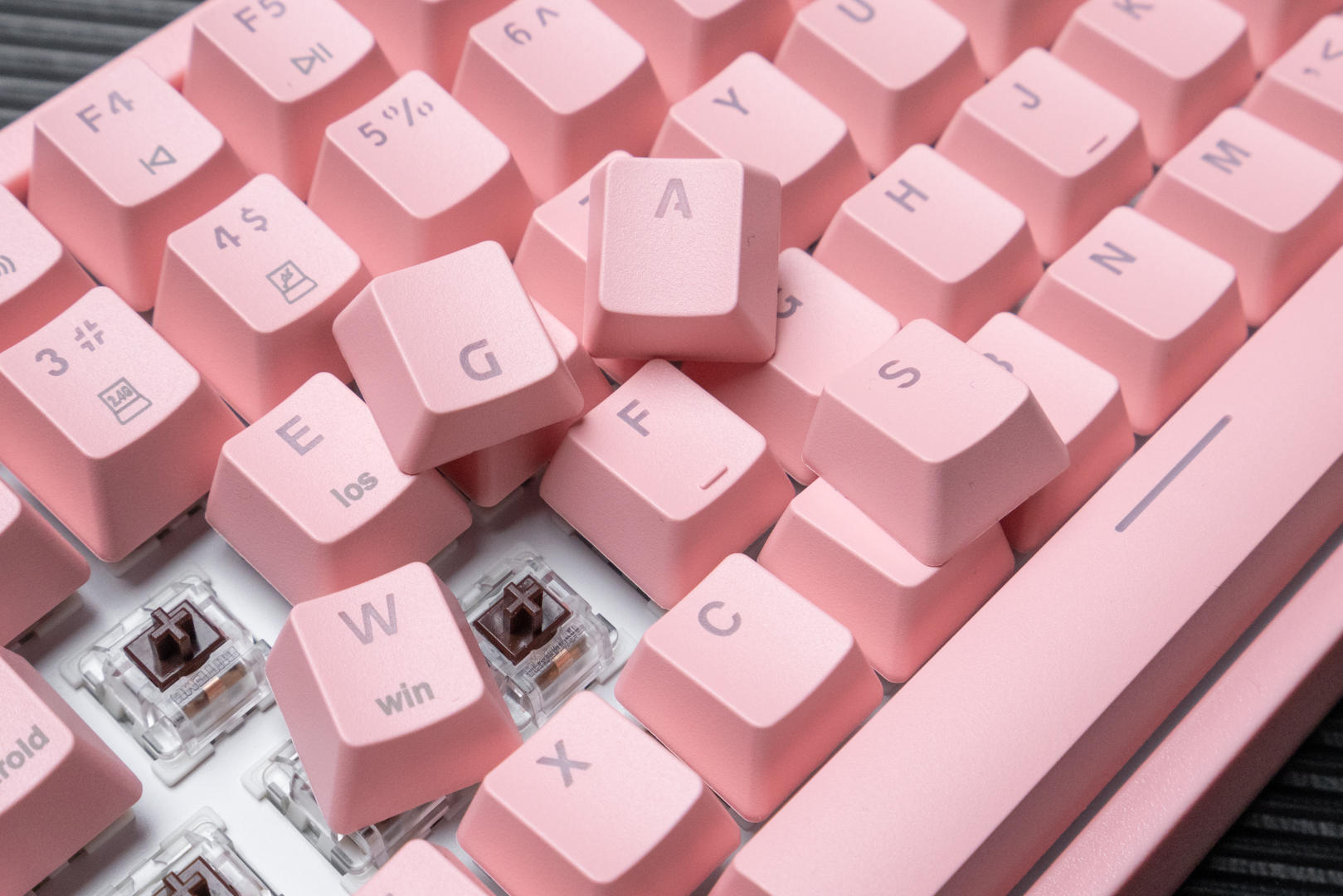 这款机械键盘的配色有两种,我选择的是猛男粉,本人对于粉色是完全没有抵抗力的。同时轴体分为青轴、红轴、茶轴三种,我选择了表现比较均衡和全面的茶轴。键盘机身外壳采用的是ABS材质,键帽采用高含量PBT材料,同时用了先进的处理工艺,摸上去手感极佳,长时间使用仍然可以保持字符的清晰度和清爽的手感。