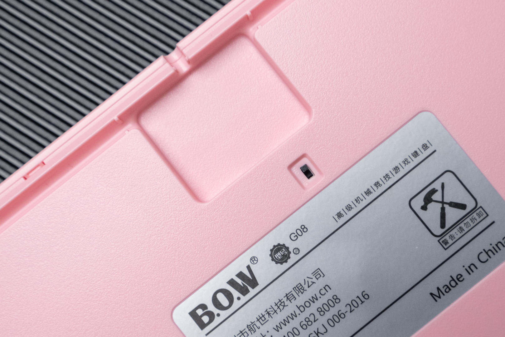 BOW 航世G08机械键盘的开关键和有线接口被设计在了底部,支持键线分离,三向出线,两侧都配有线材的导轨,可以根据自己的使用需求和使用习惯选择出线的方向,这种设计还是非常人性化的。