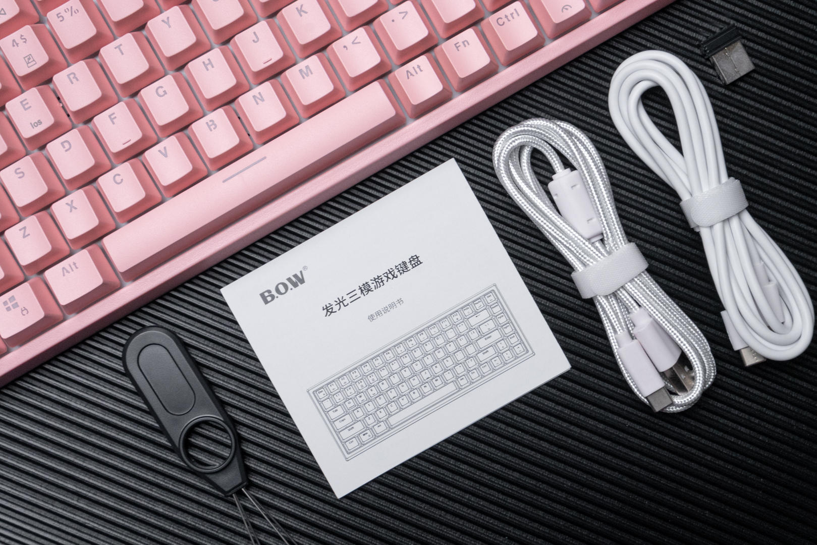 键盘的包装盒挺精致的,白顶蓝底象征着白云和大海,有那种航海的感觉。包装内除了键盘本体以外,还有一个2.5G接收器、两根不同接口的的数据线、拔键器和说明书。